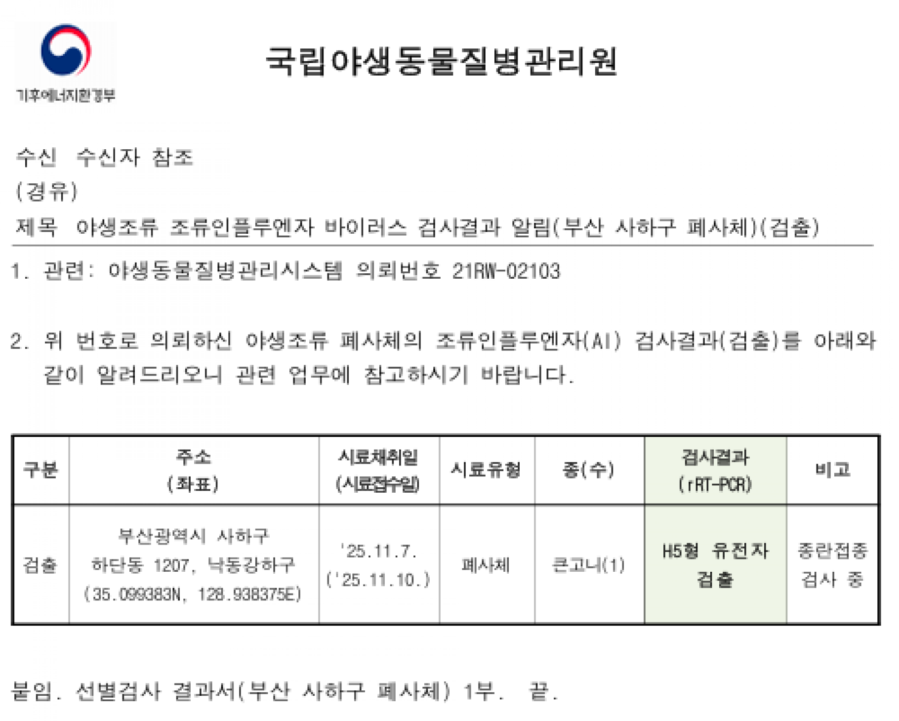 (부산 사하구)야생조류 조류인플루엔자(H5) 항원 검출에 따른 차단방역 및 예찰 강화 알림