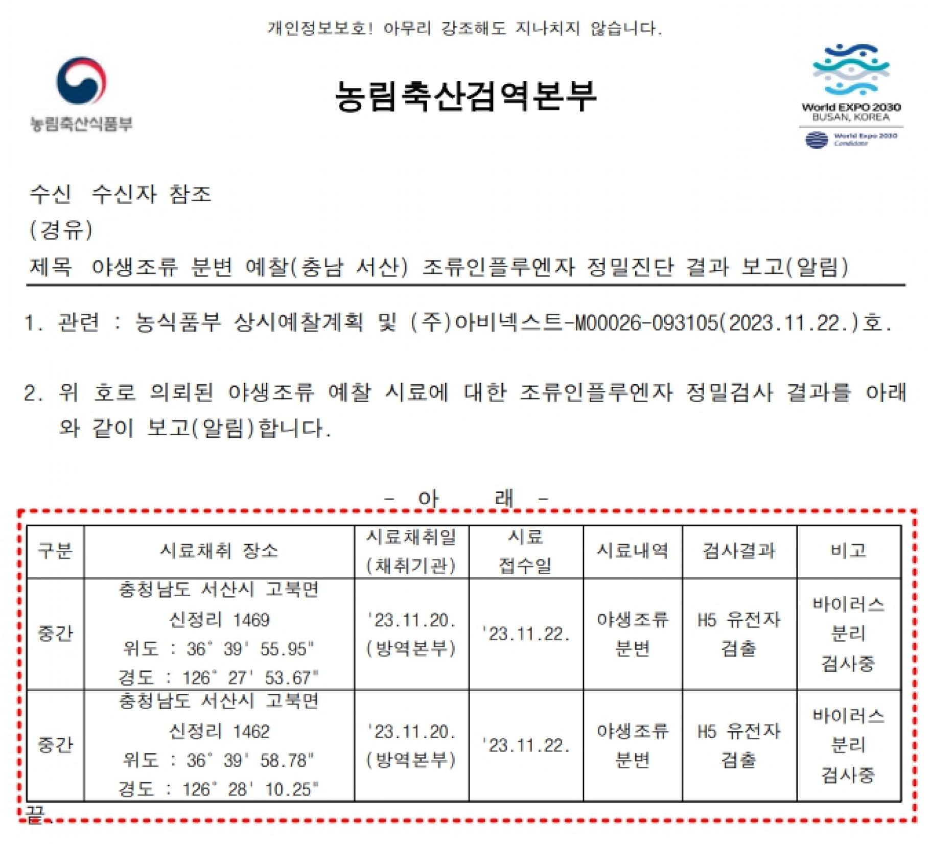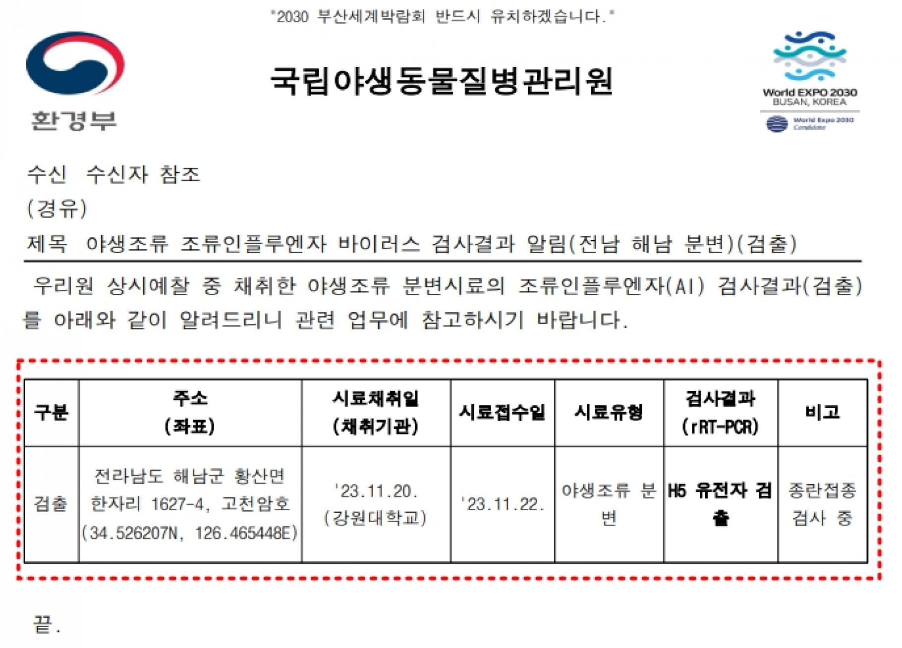 [전남 해남, 충남 서산] 야생조류 H5형 조류인플루엔자(AI) 항원 검출에 따른 차단방역 및 예찰 강화 알림