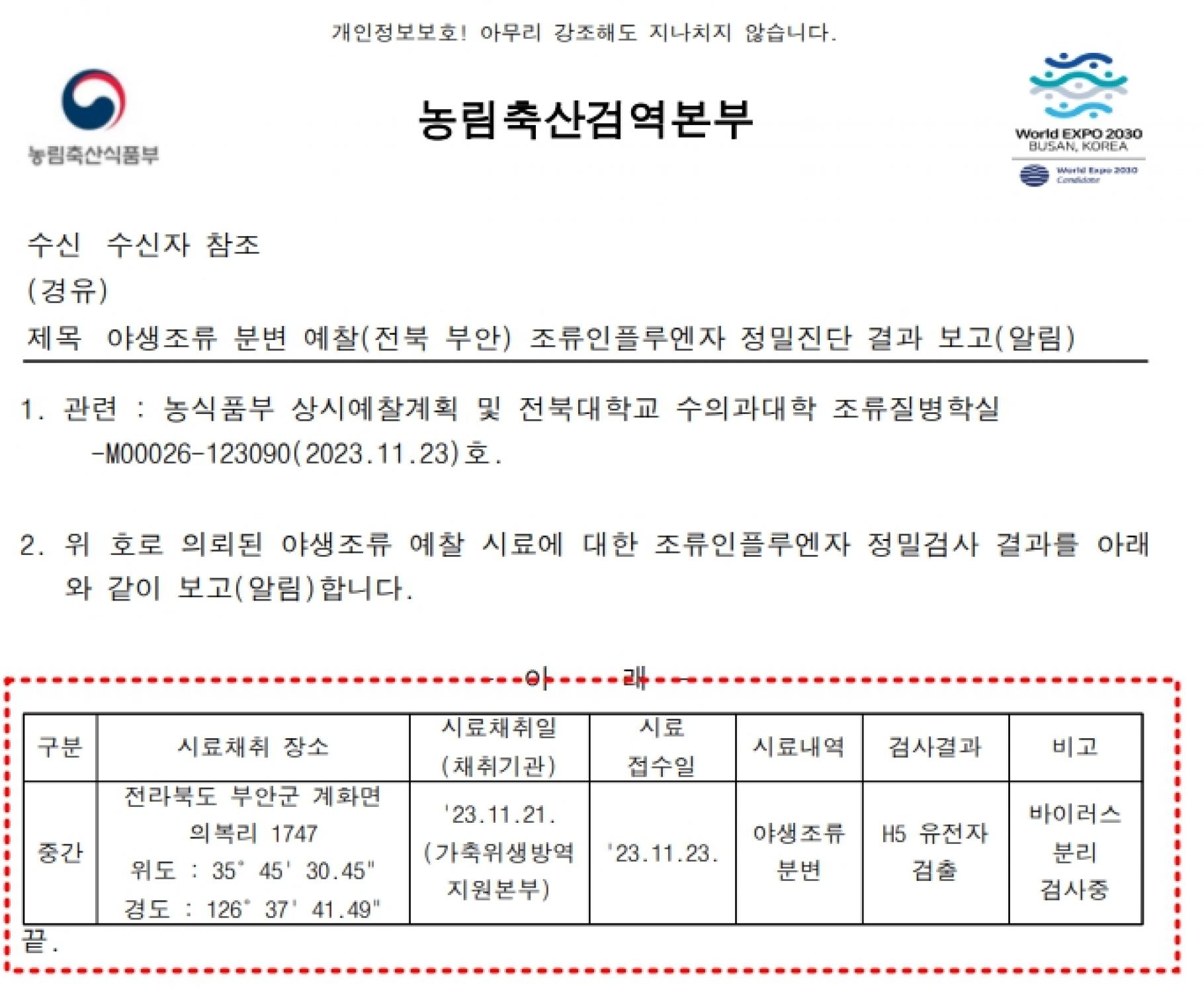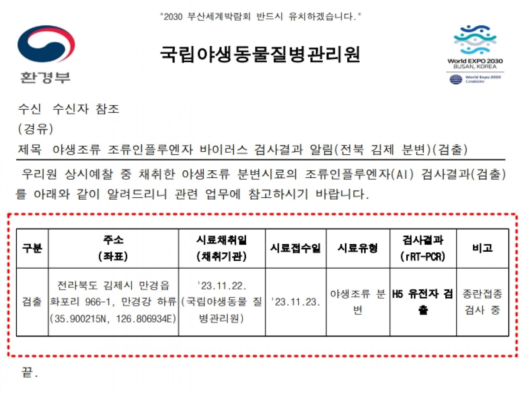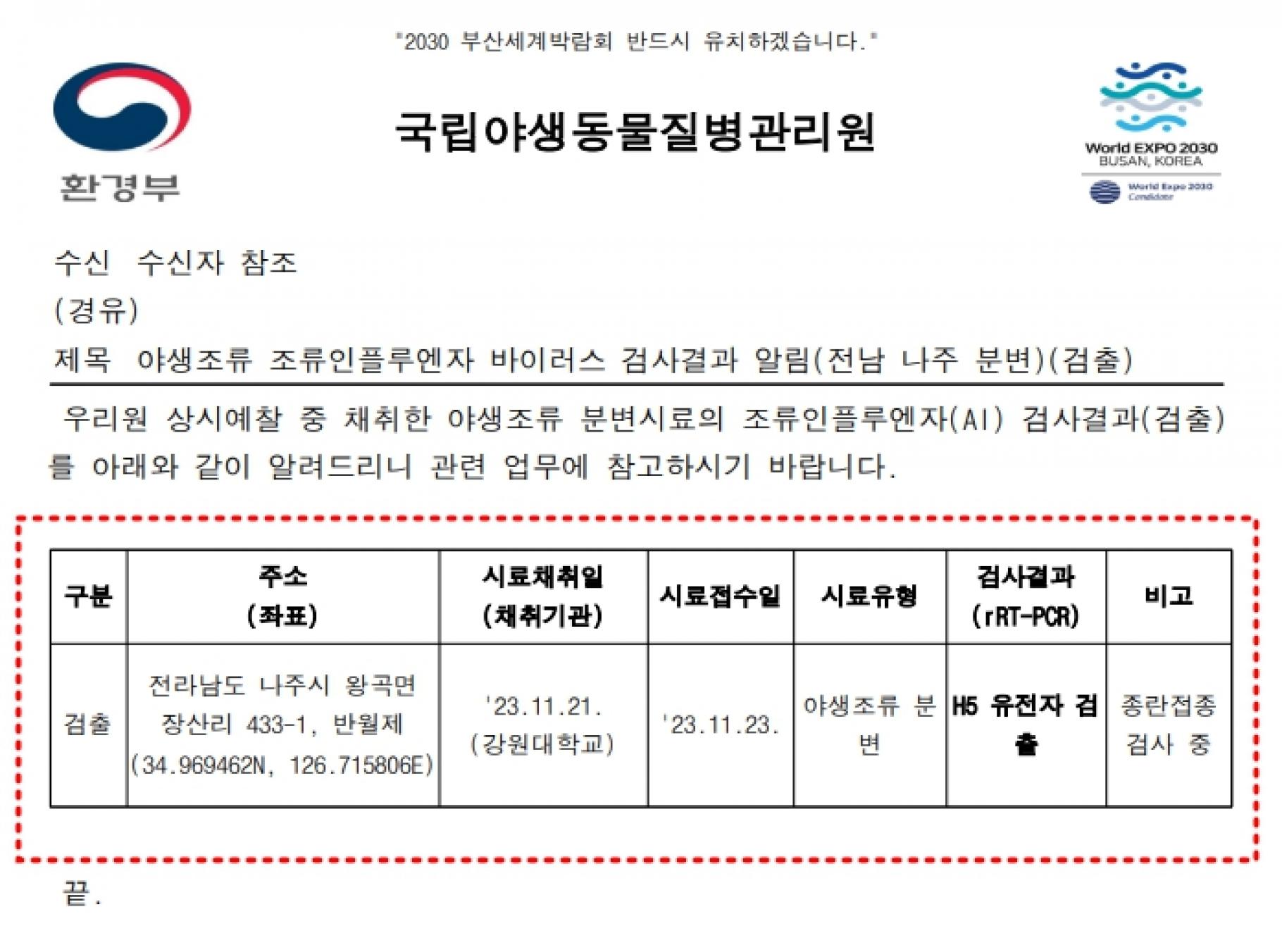 [전북 부안, 전북 김제, 전남 나주] 야생조류 H5형 조류인플루엔자(AI) 항원 검출에 따른 차단방역 및 예찰 강화 알림