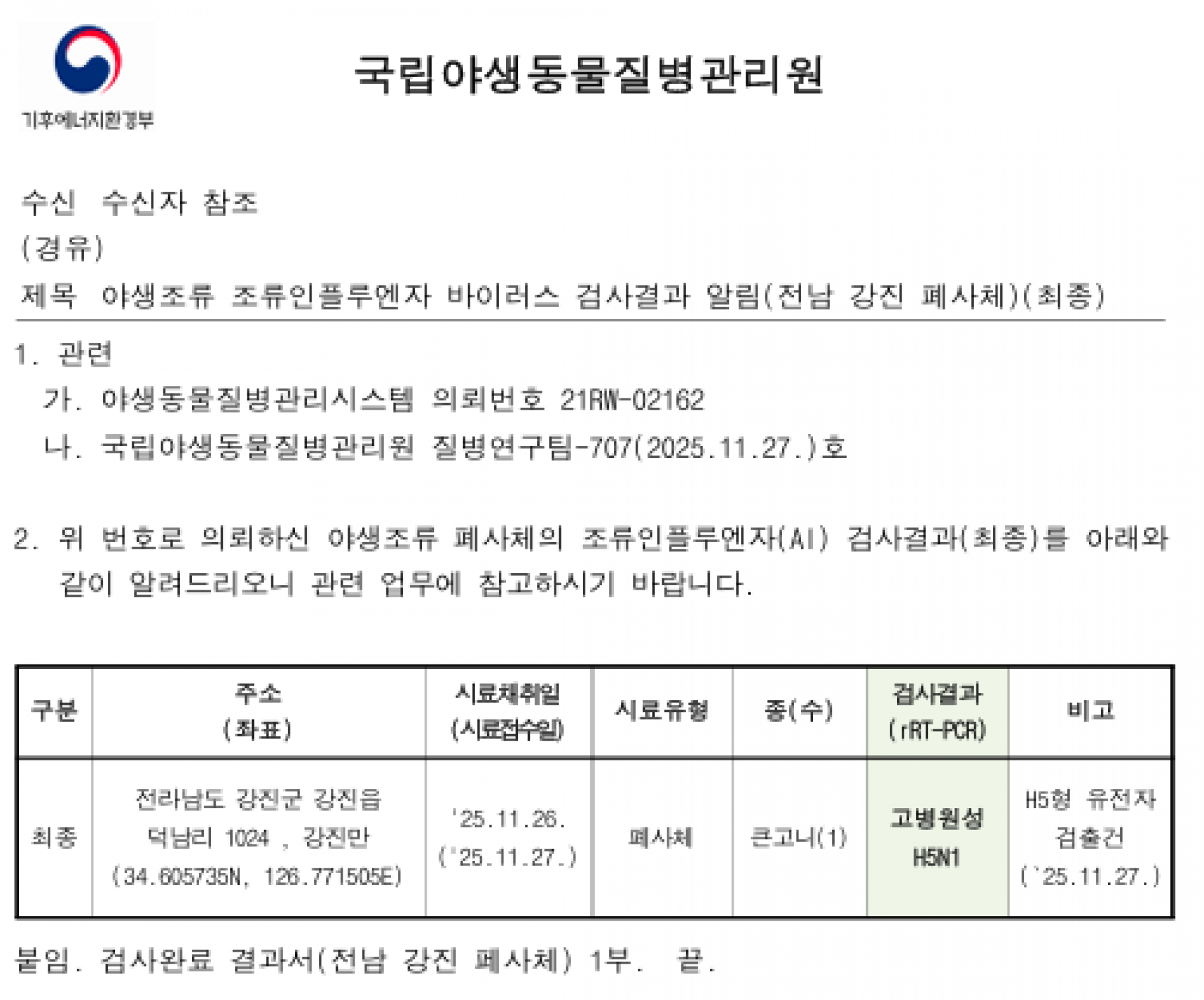 (전남 강진)야생조류 고병원성 조류인플루엔자(H5형) 검출에 따른 차단방역 강화 알림