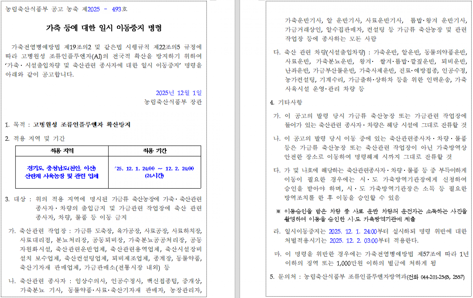 가축(산란계) 등에 대한 일시 이동중지(Standstill) 명령 발령 알림
