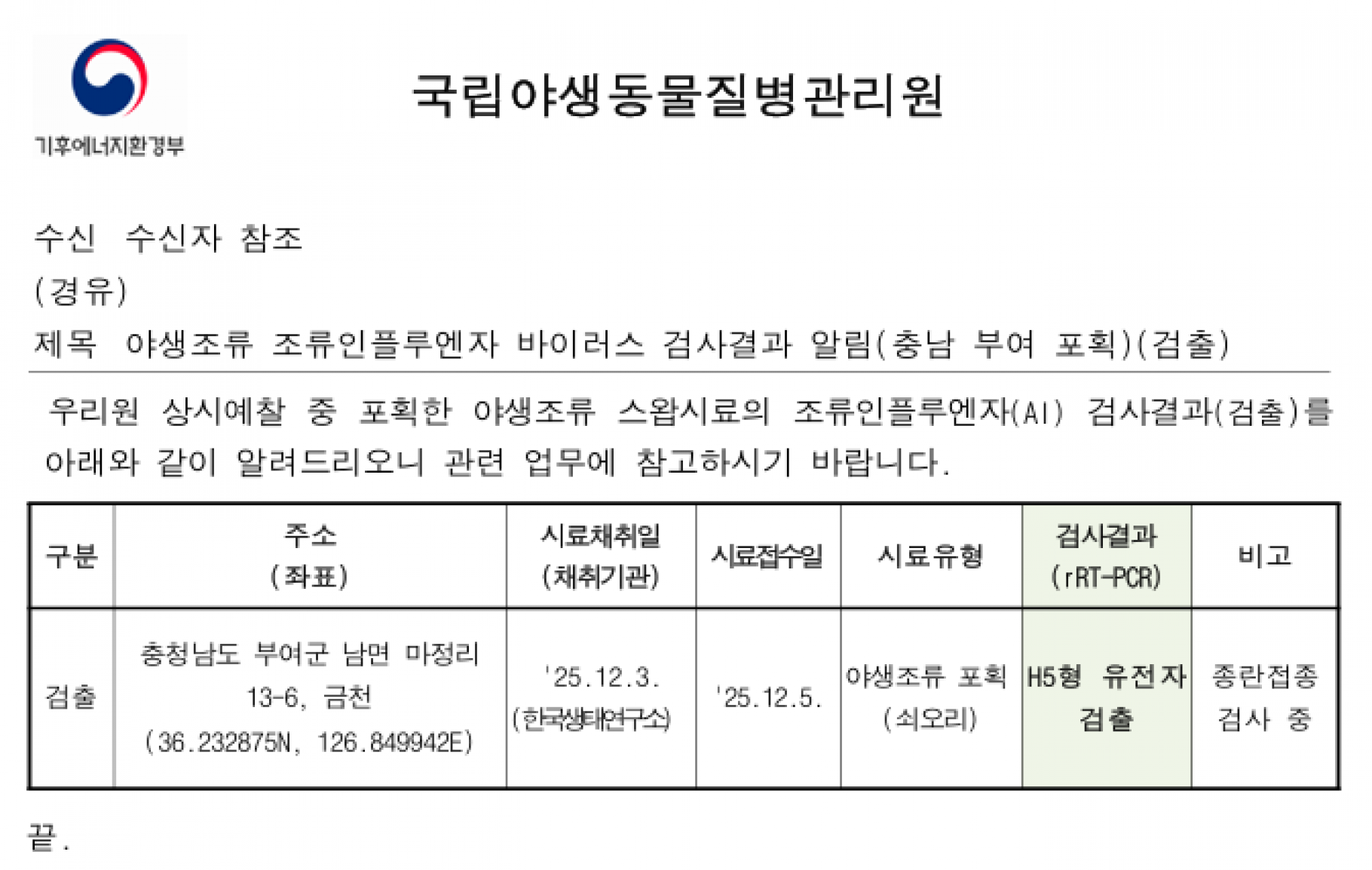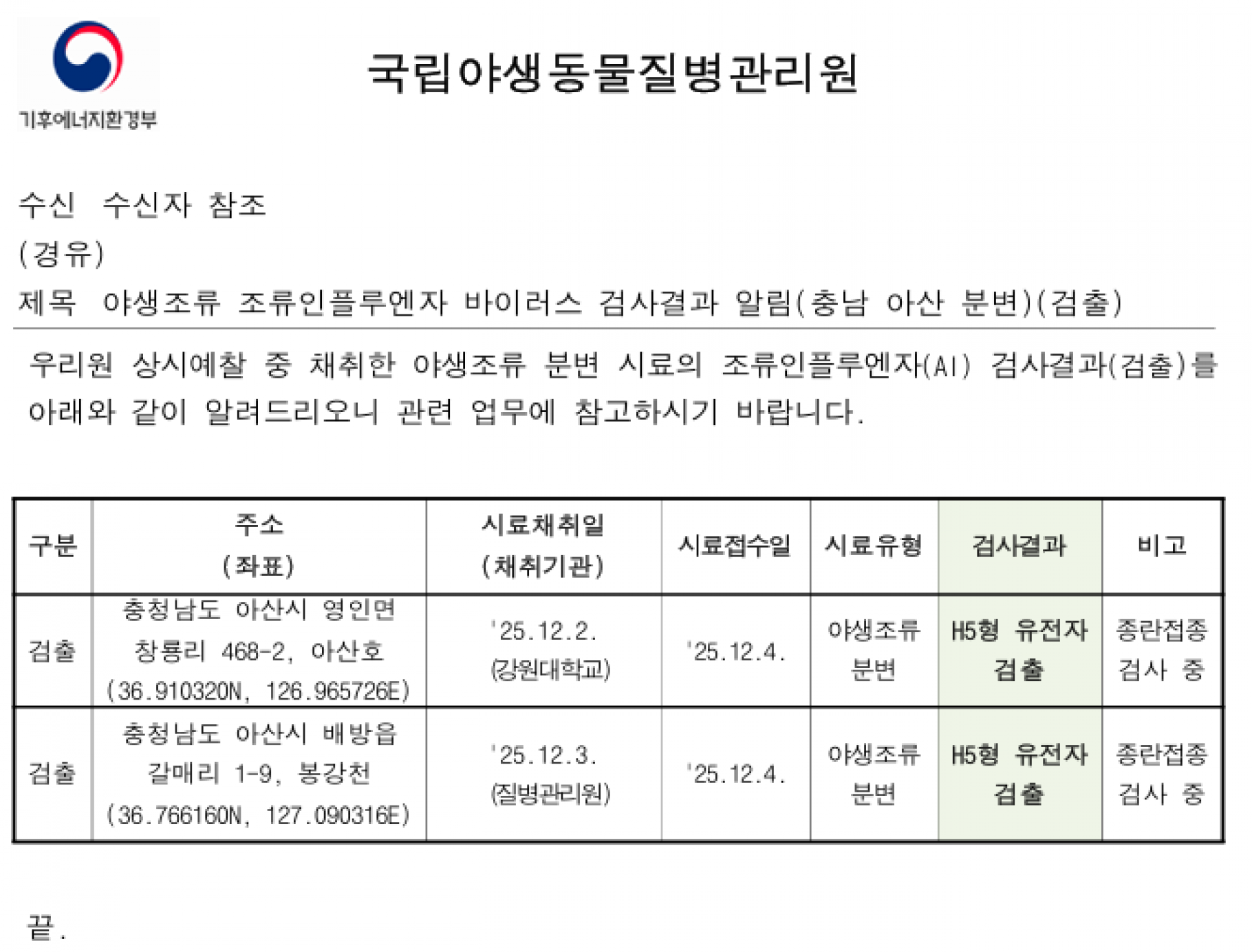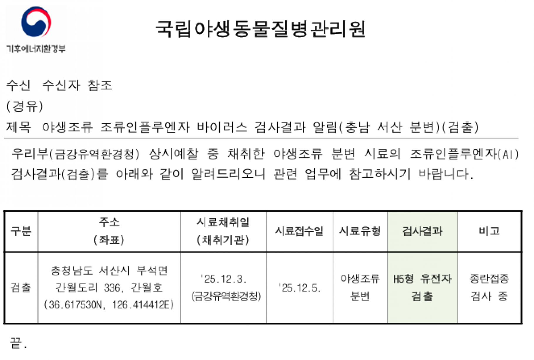 (충남 아산, 서산, 부여) 야생조류 조류인플루엔자(H5) 항원 검출에 따른 차단방역 및 예찰 강화 알림