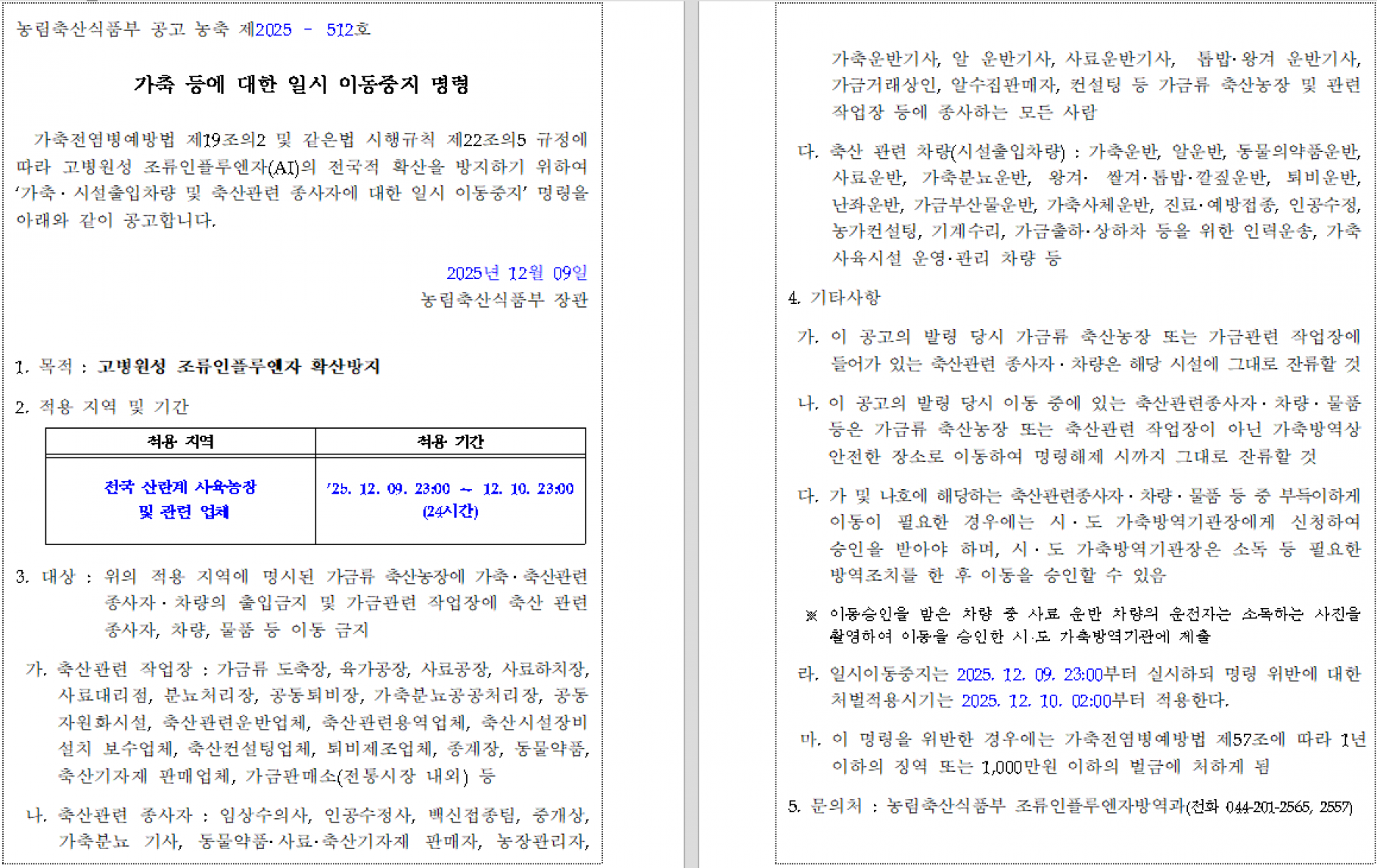 가축(산란계) 등에 대한 일시 이동중지(Standstill) 명령 발령 알림