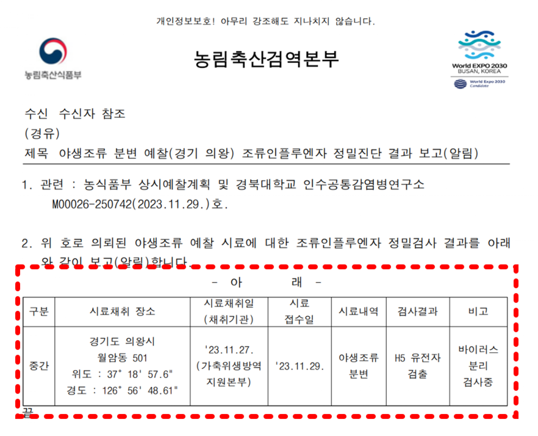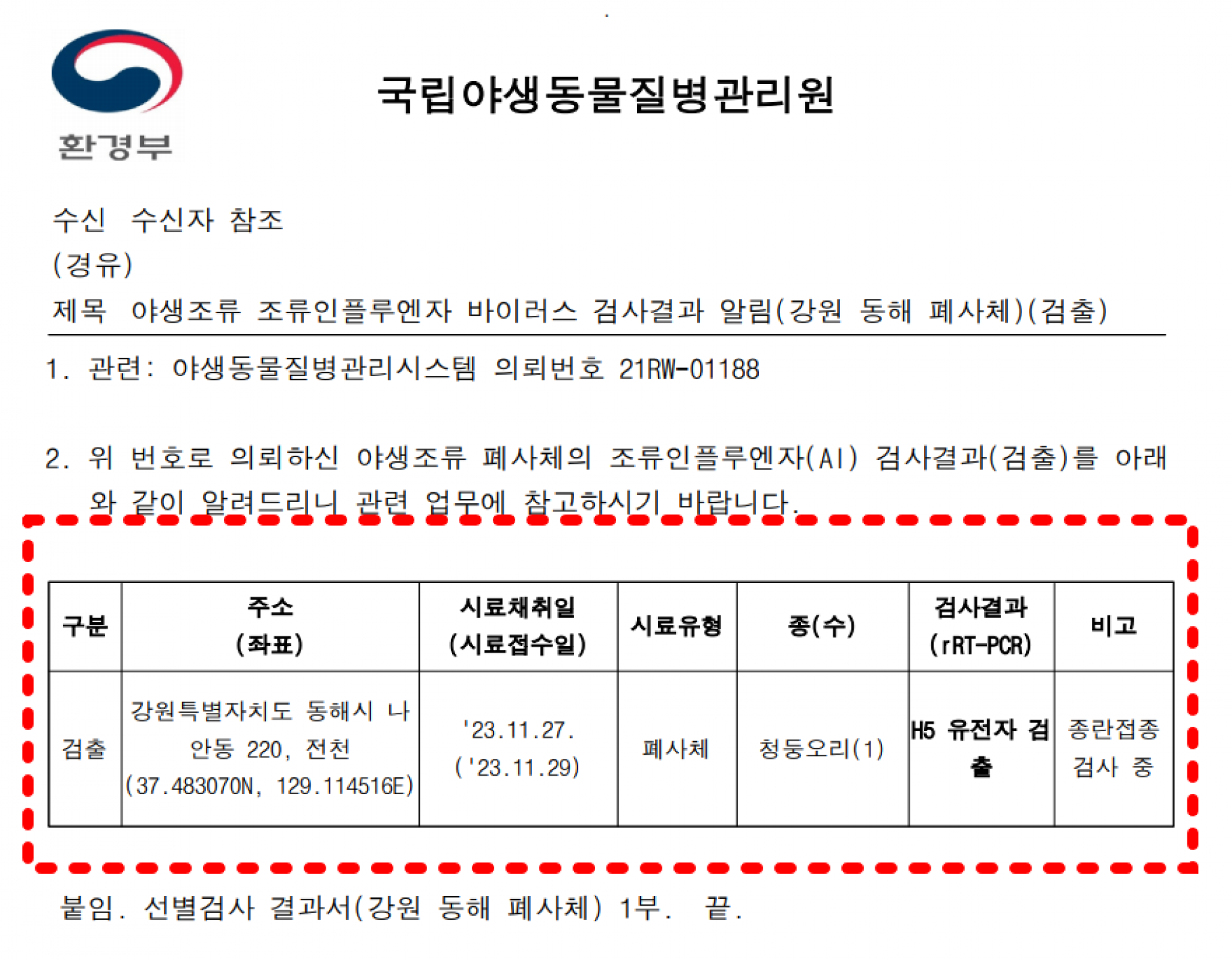 (경기 의왕, 강원 동해) 야생조류 H5형 조류인플루엔자(AI) 항원 검출에 따른 차단방역 및 예찰 강화 알림