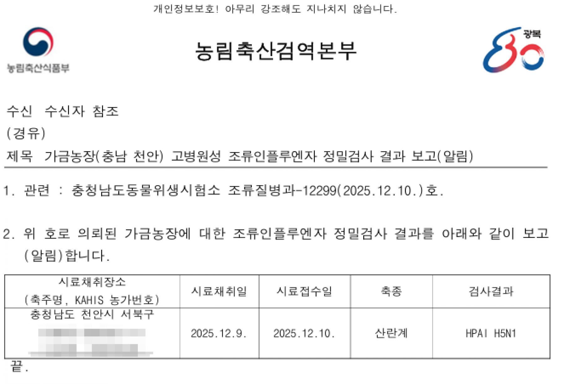 충남 천안 예방적 살처분 가금농장(산란계) 고병원성 조류인플루엔자(AI) 확진에 따른 방역조치 알림