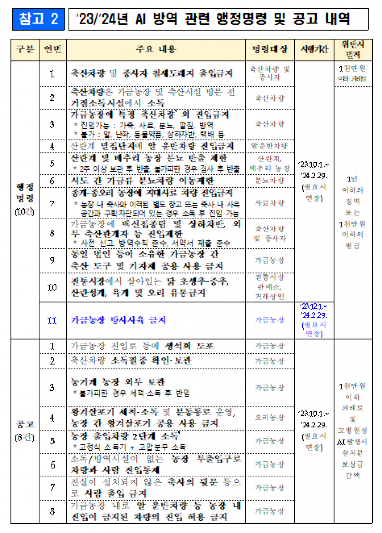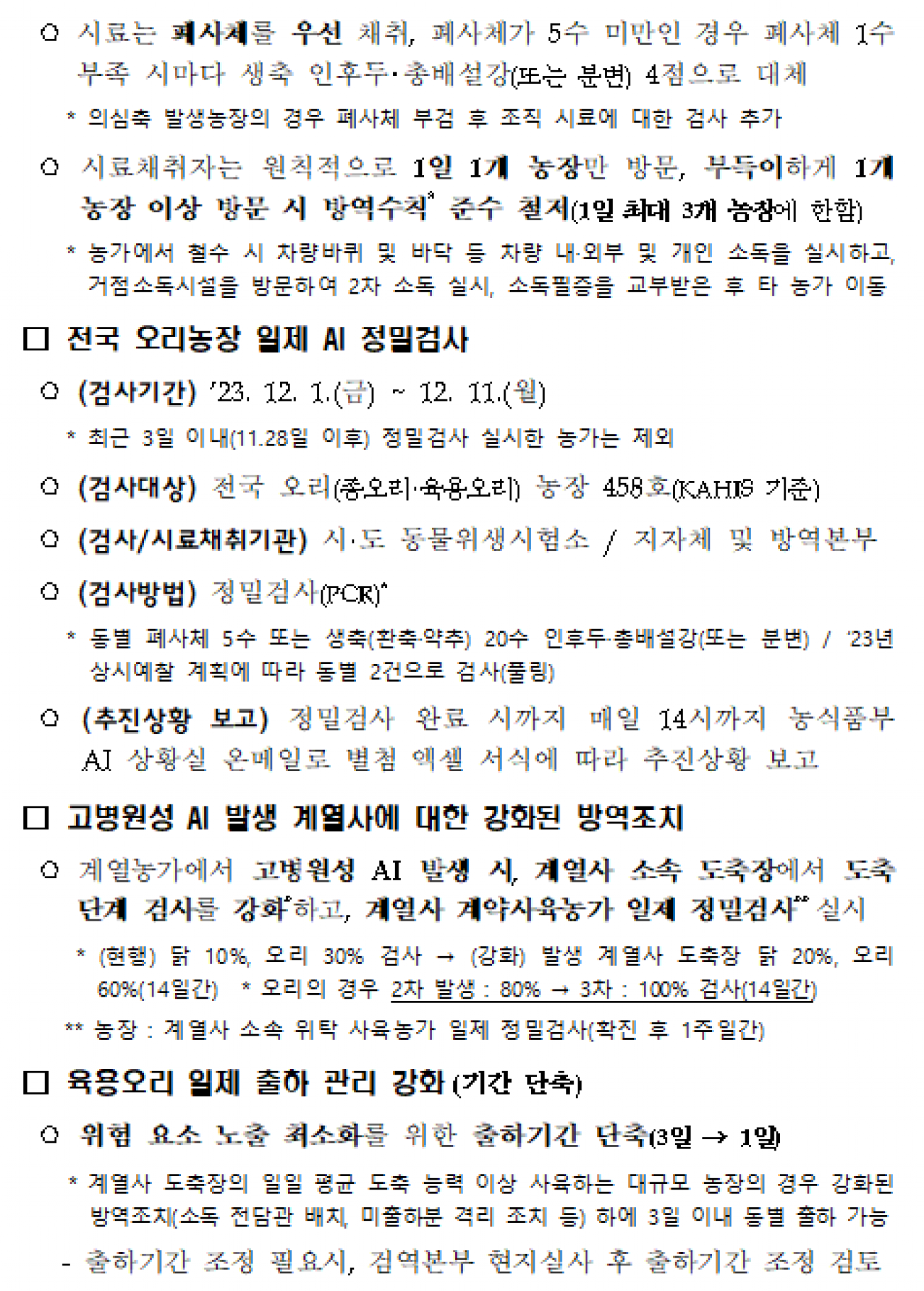 야생조류 고병원성 AI 확진에 따른 긴급 방역조치 계획입니다. '23.11.27일 전북 전주시 소재 철새도래지(만경강중류) 야생조류(홍머리오리)에서 고병원성 AI가 검출됨에 따라 긴급 방역조치 방안을 아래와 같이 알려드리니 방역이행에 철저를 기해 주시기 바랍니다. ![]() ![]() ![]() ![]() ![]()
