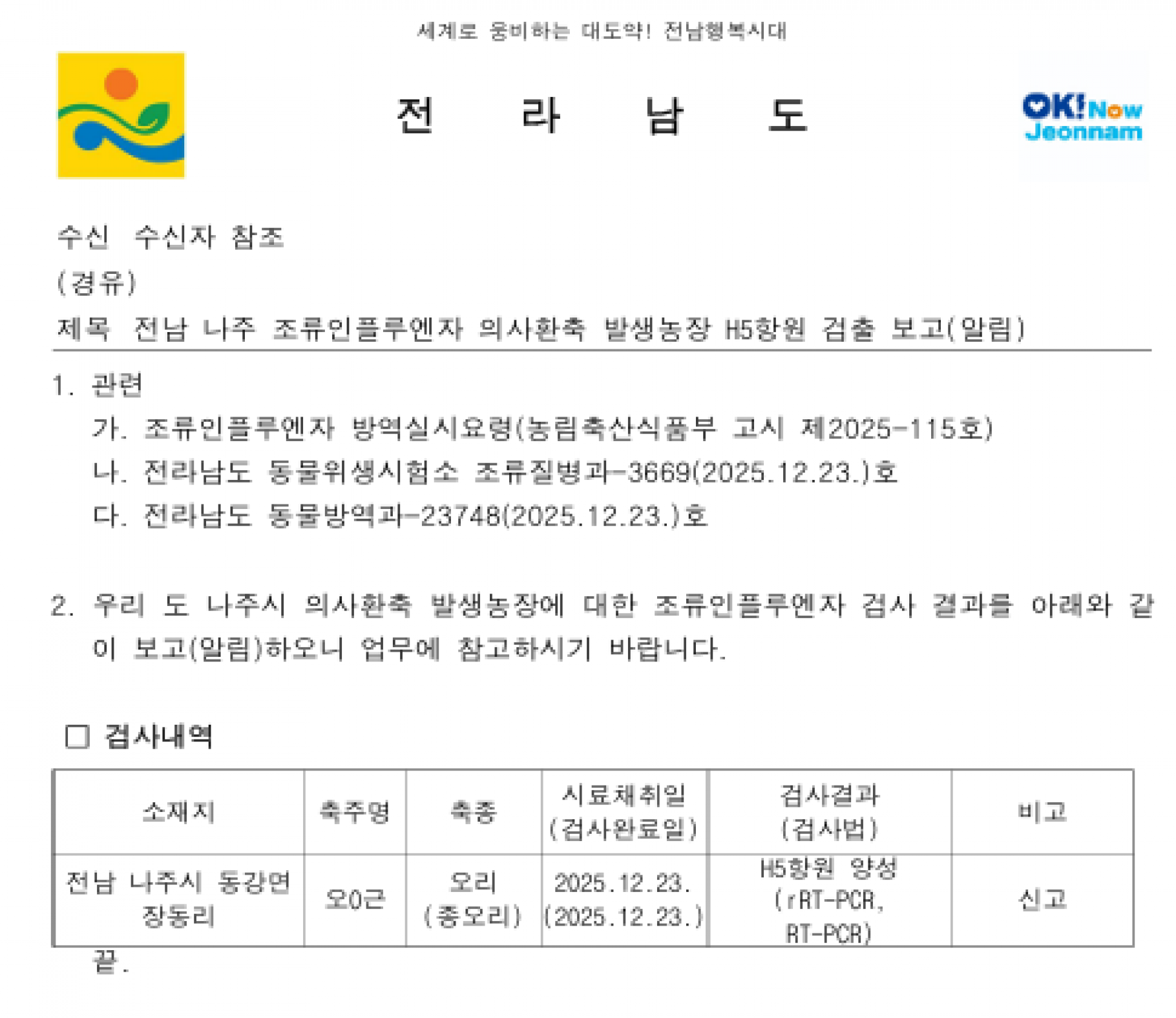 전남 나주 가금농장(종오리) 고병원성 AI 의사환축 발생에 따른 방역강화 조치