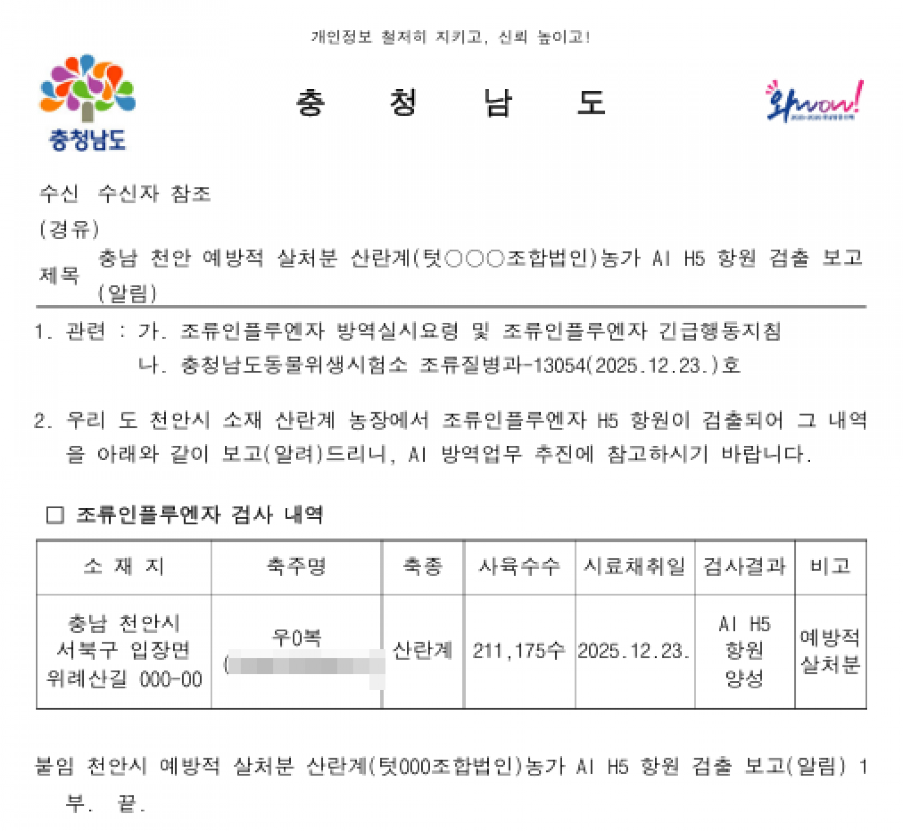 충남 천안 예방적 살처분 가금농장(산란계) 고병원성 AI 의사환축 발생에 따른 방역강화 조치