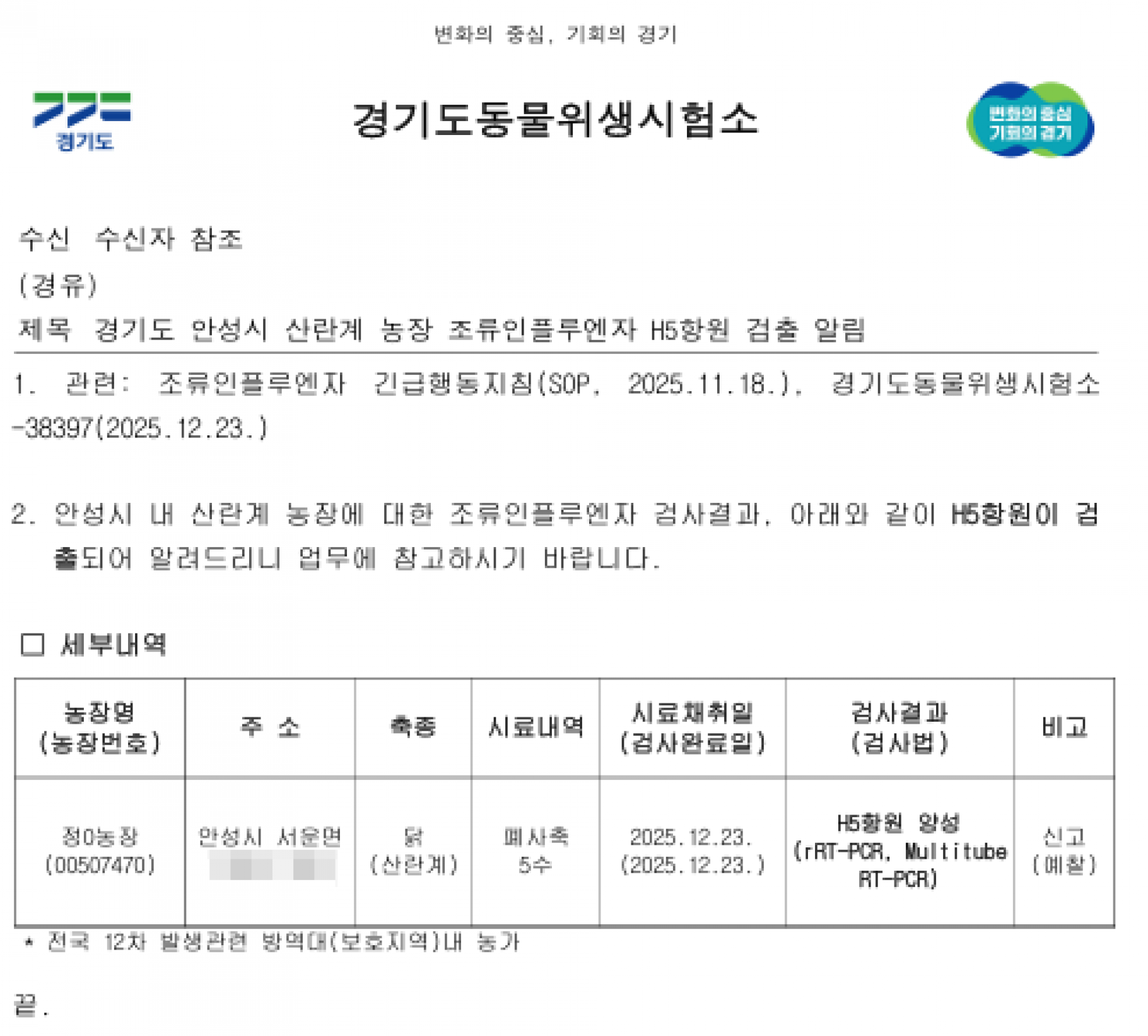 경기 안성 가금농장(산란계) 고병원성 AI 의사환축 발생에 따른 방역강화 조치
