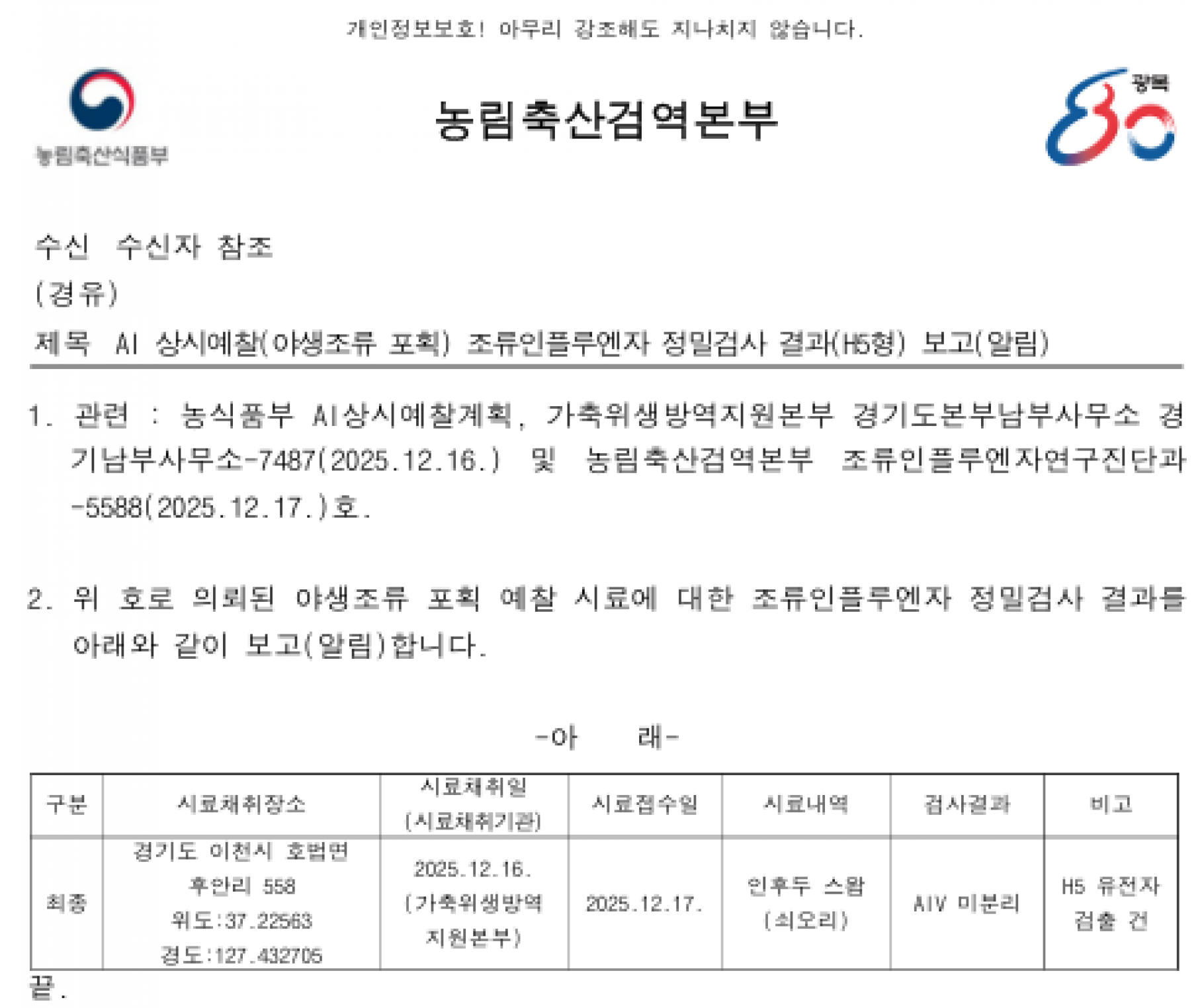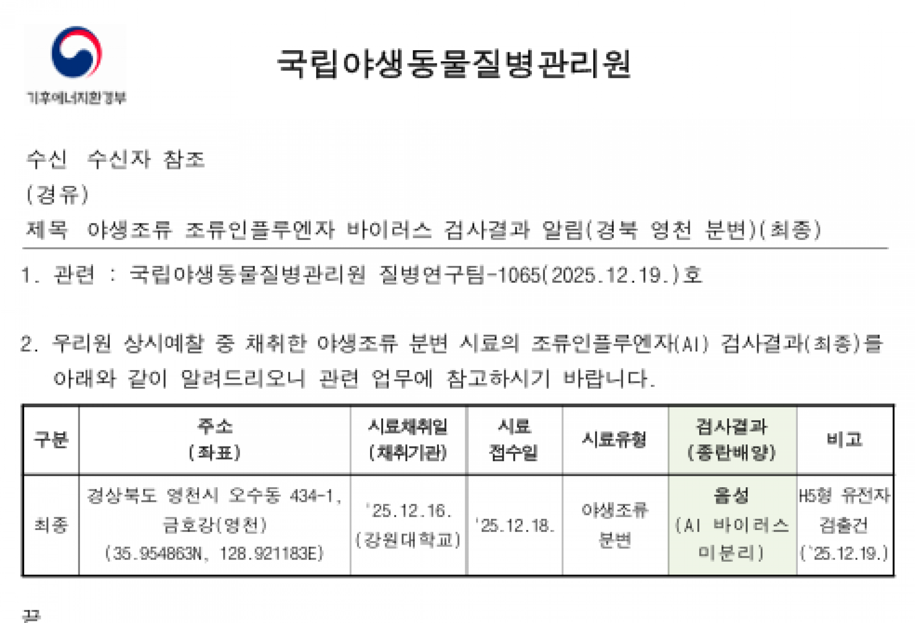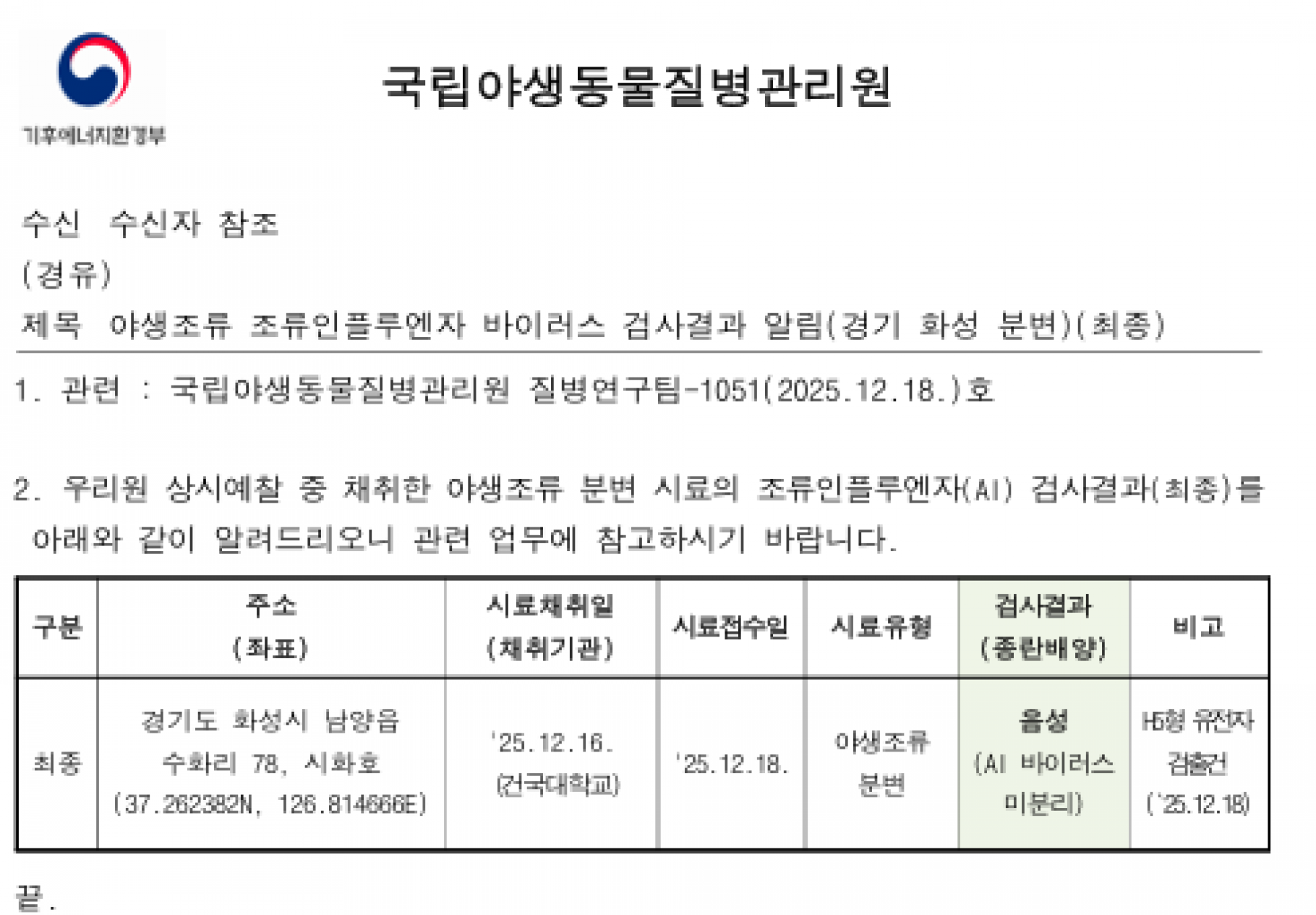 경기(화성), 경기(이천) 및 경북(영천) 소재 야생조류 AI 항원 미분리 지점 관리에 대한 후속조치 알림