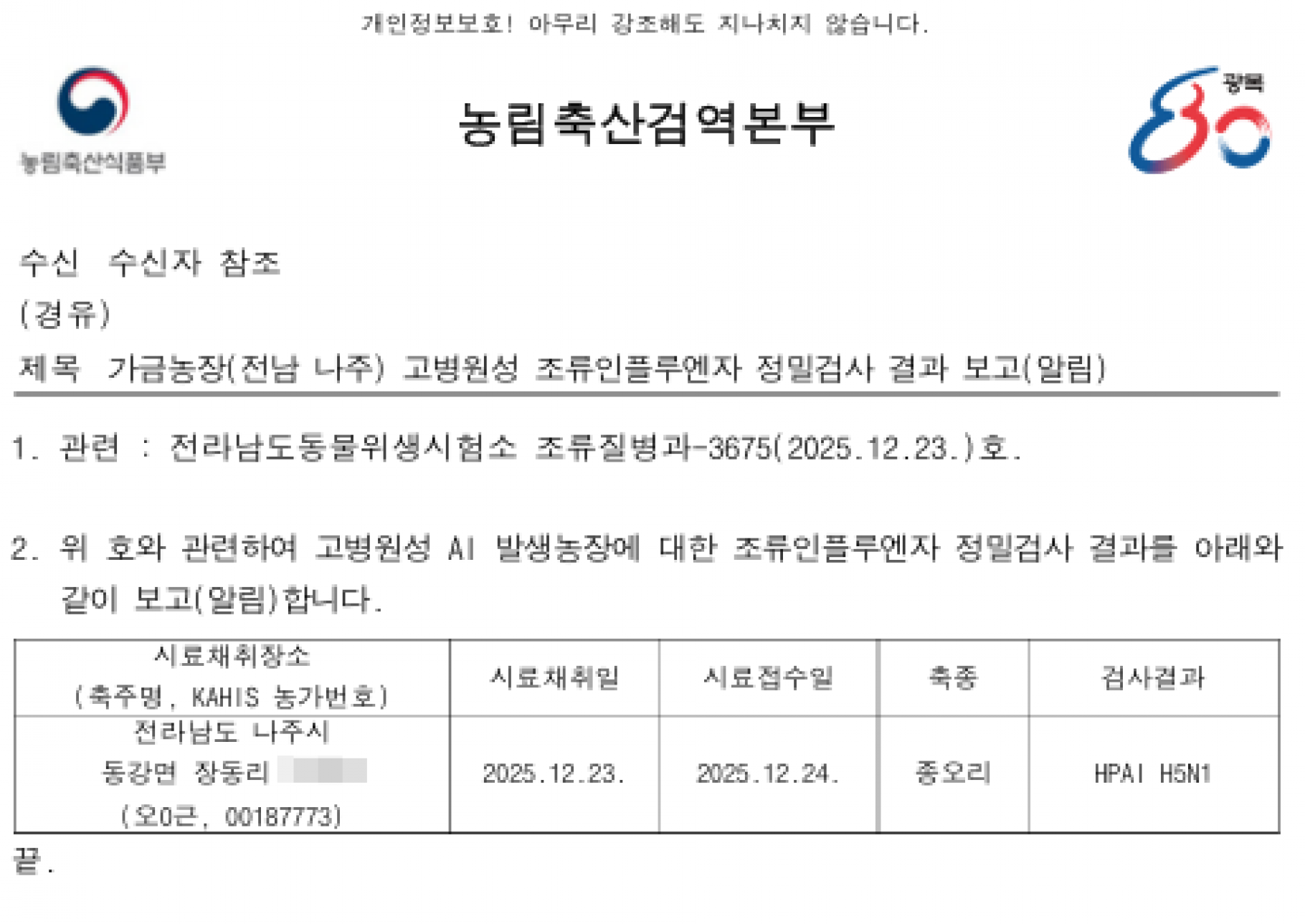 전남 나주 가금농장(종오리) 고병원성 조류인플루엔자(AI) 확진에 따른 방역조치 알림