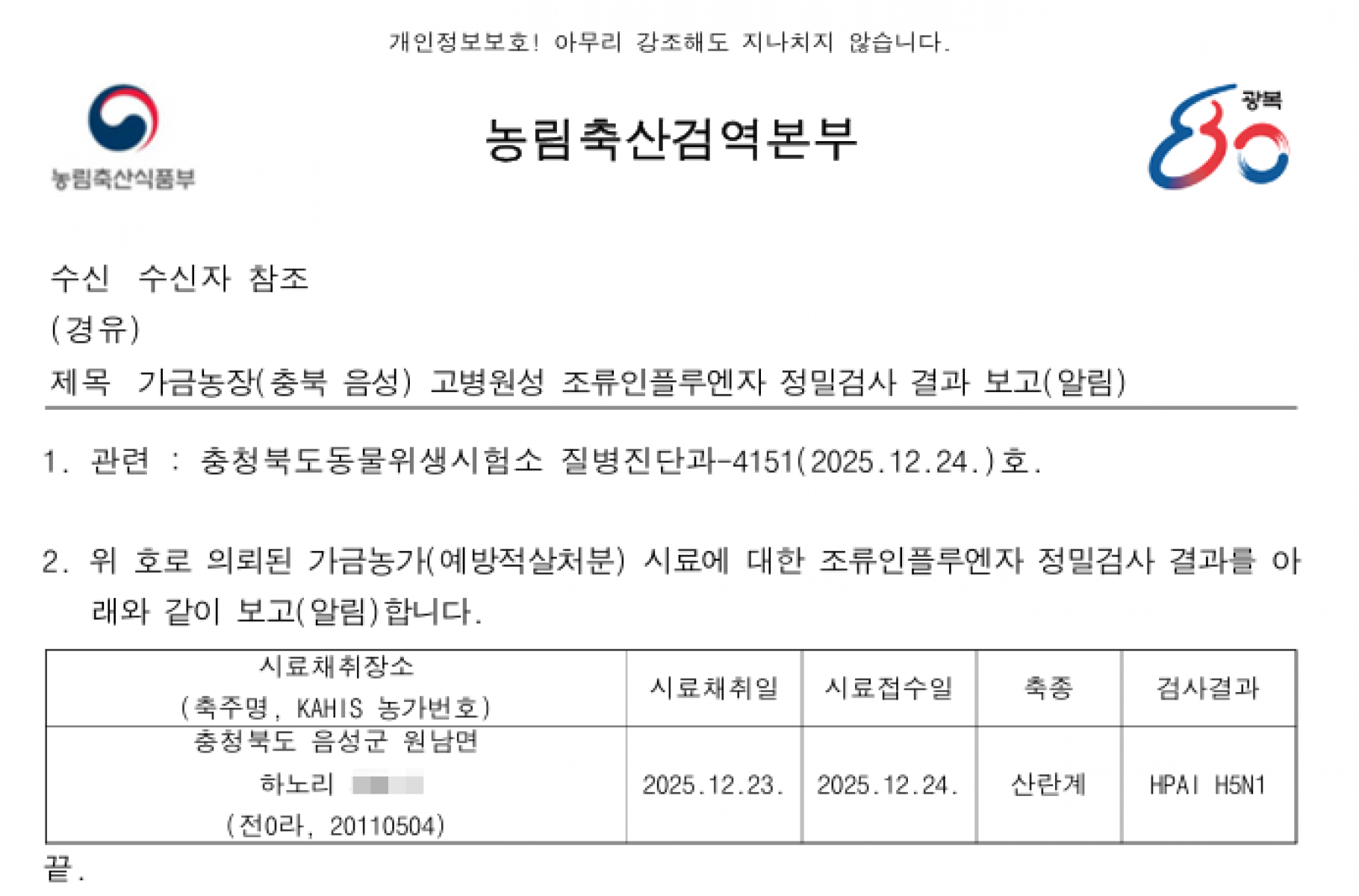 충북 음성 예방적 살처분 가금농장(산란계) 고병원성 조류인플루엔자(AI) 확진에 따른 방역조치 알림
