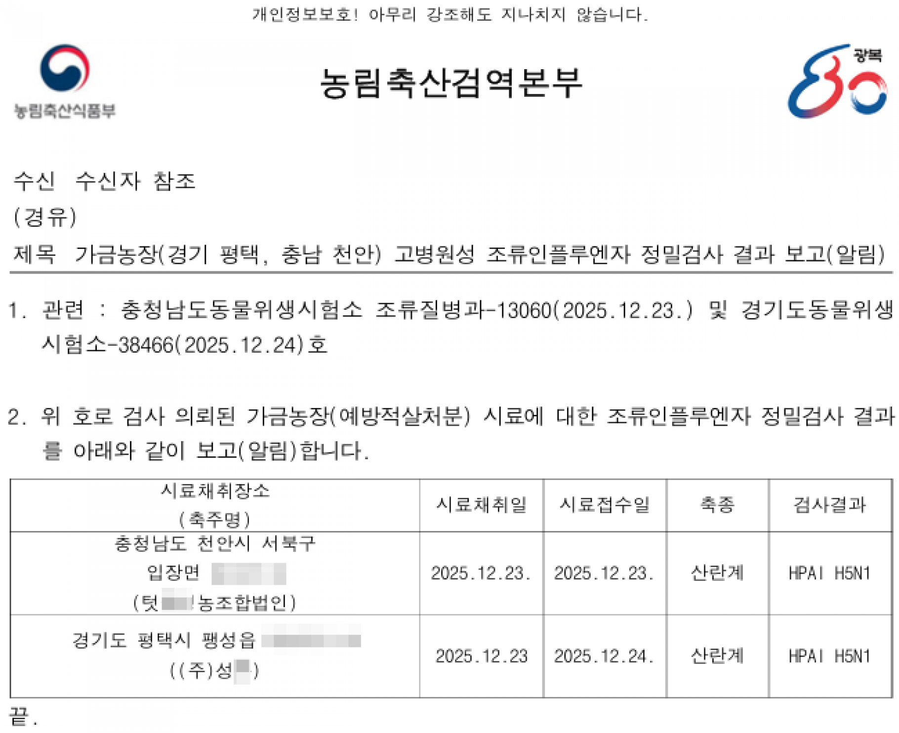 경기 평택 및 충남 천안 예방적 살처분 가금농장(산란계) 고병원성 조류인플루엔자(AI) 확진에 따른 방역조치 알림