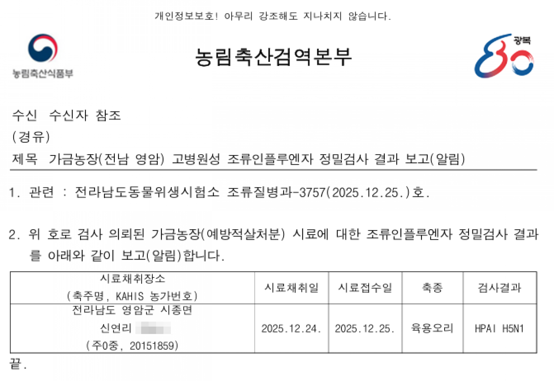 전북 고창 및 전남 영암 예방적 살처분 가금농장(육용오리) 고병원성 조류인플루엔자(AI) 확진에 따른 방역조치 알림