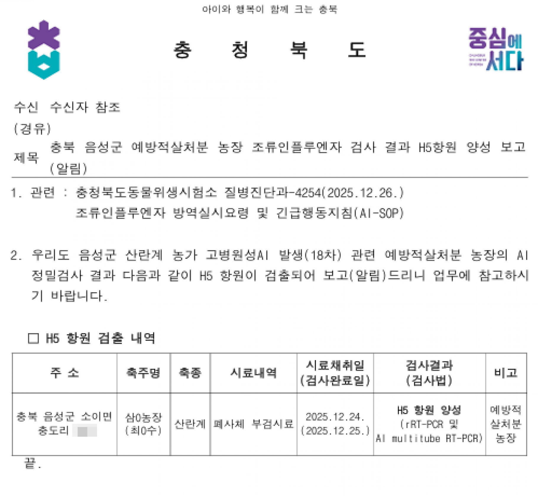충북 음성 예방적 살처분 가금농장(산란계) 고병원성 AI 의사환축 발생에 따른 방역강화 조치