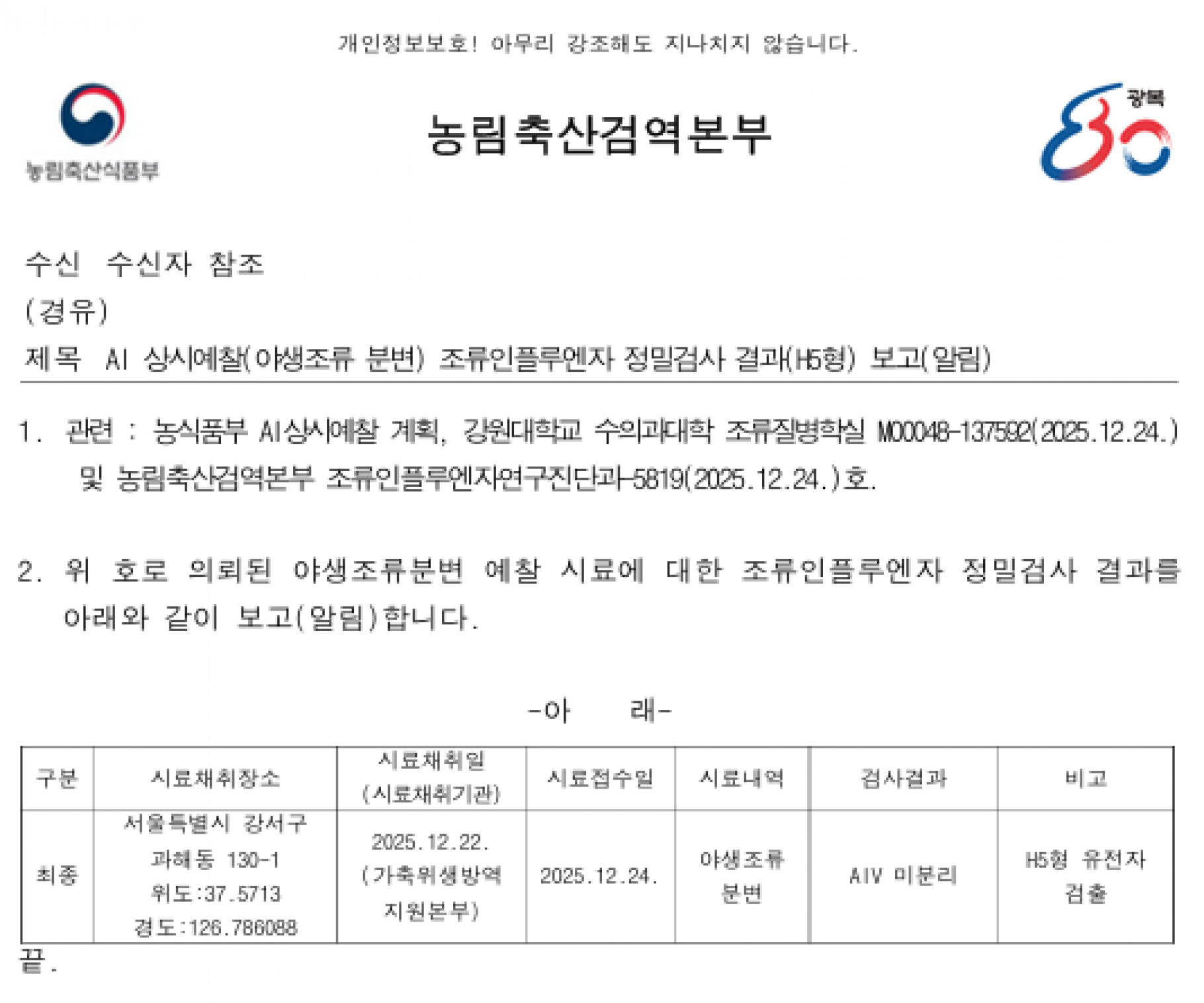 서울 소재 야생조류 AI 항원 미분리 지점 관리에 대한 후속조치 알림