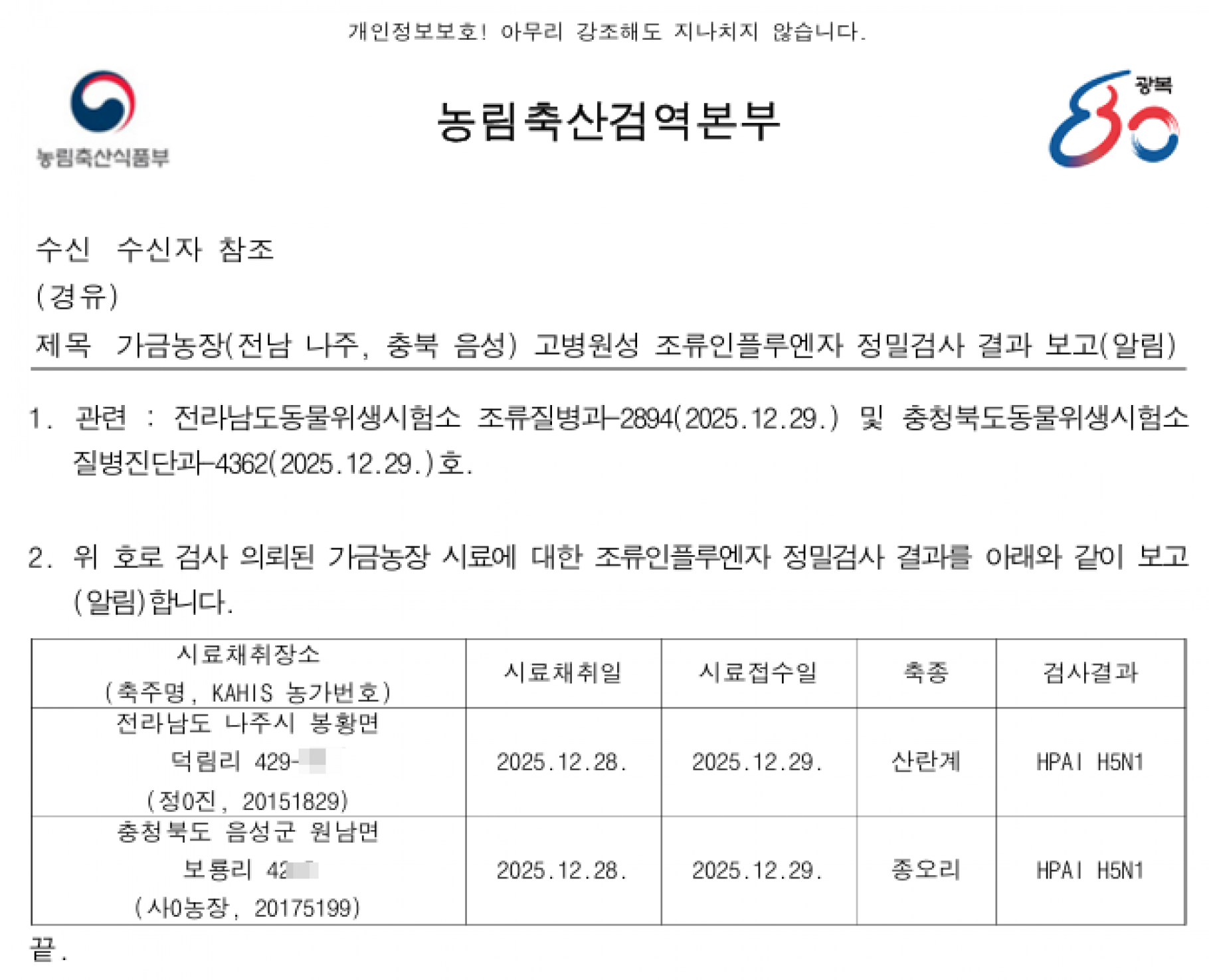 충북 음성(종오리) 및 전남 나주(산란계) 가금농장 고병원성 조류인플루엔자(AI) 확진에 따른 방역조치 알림