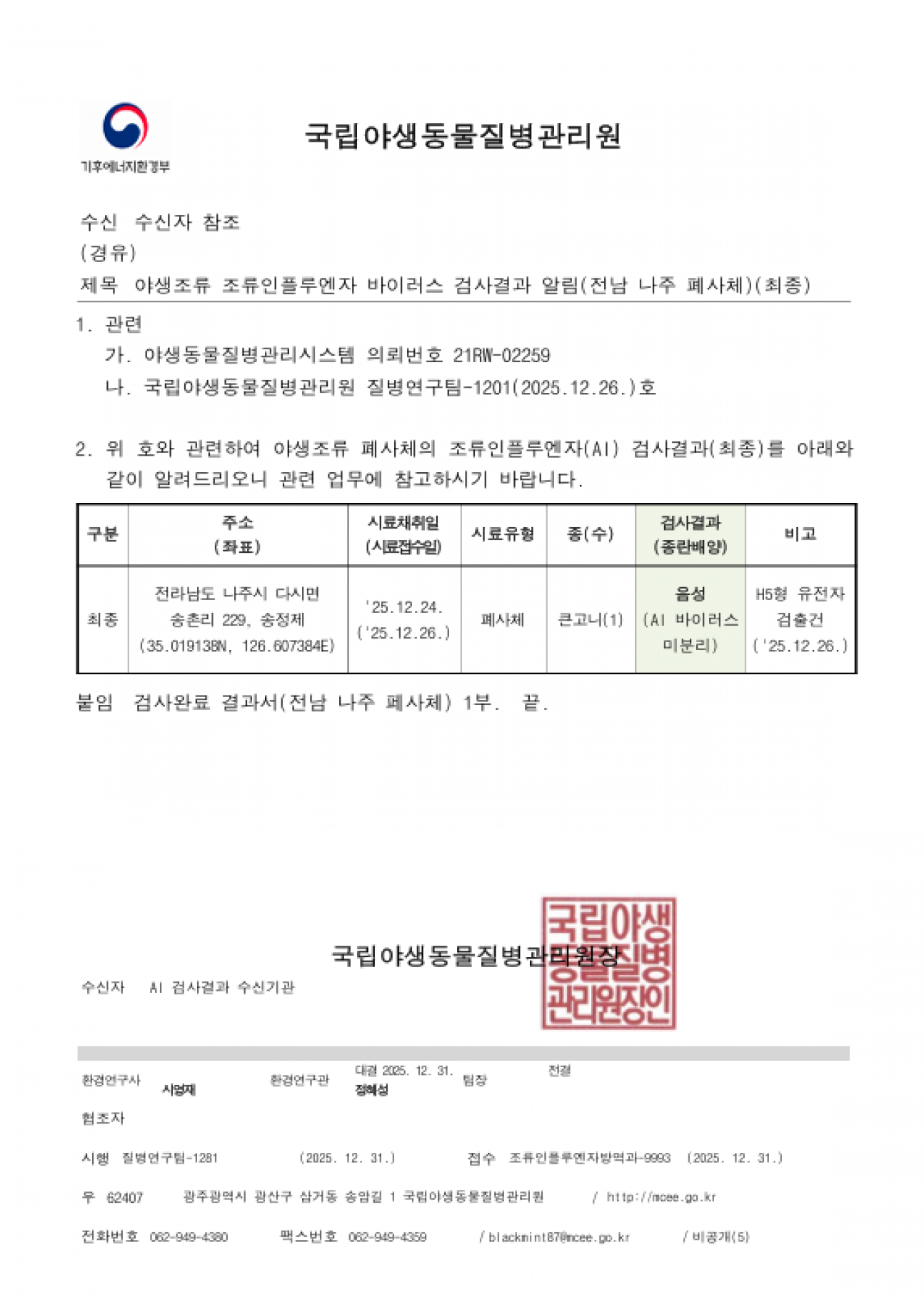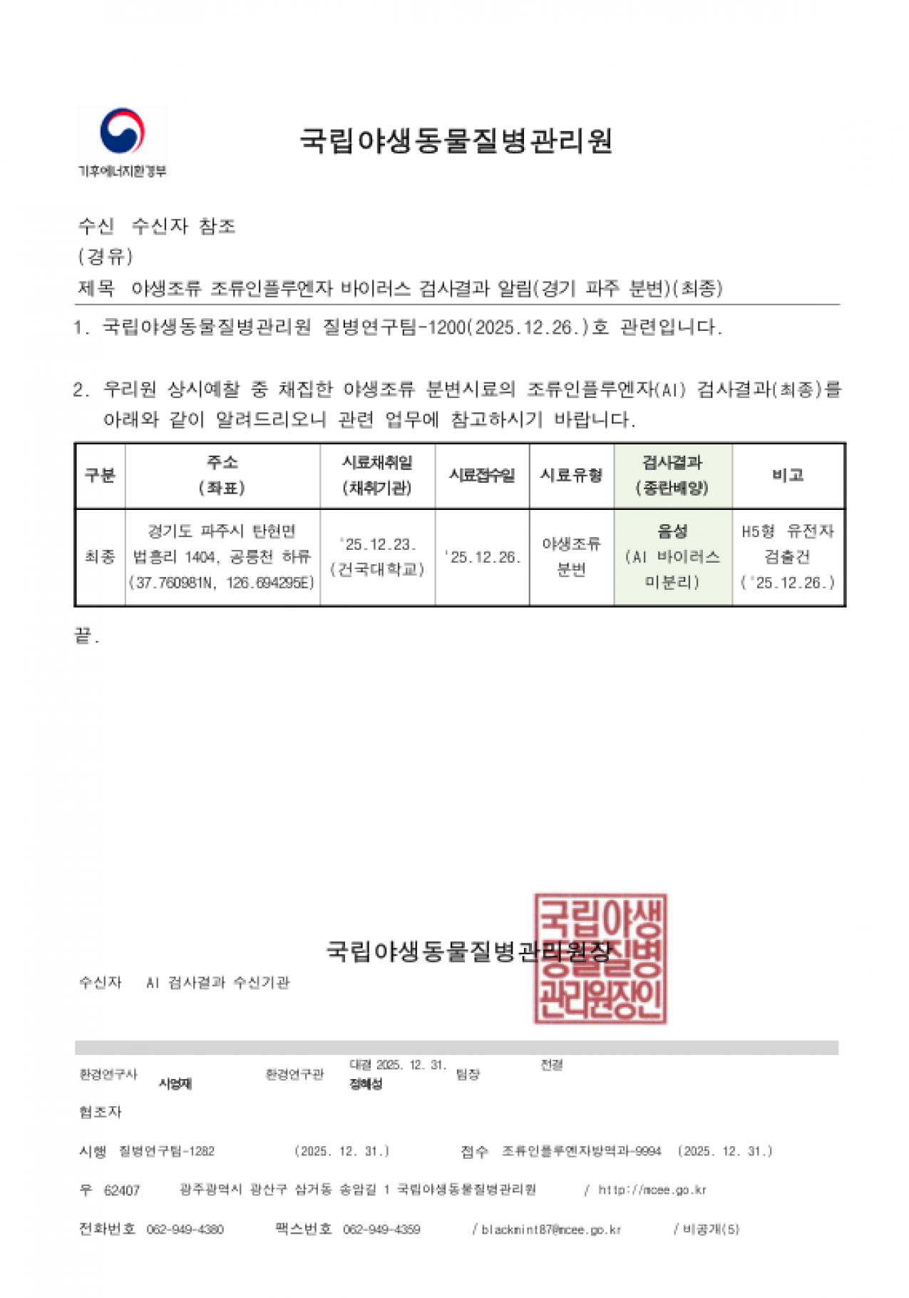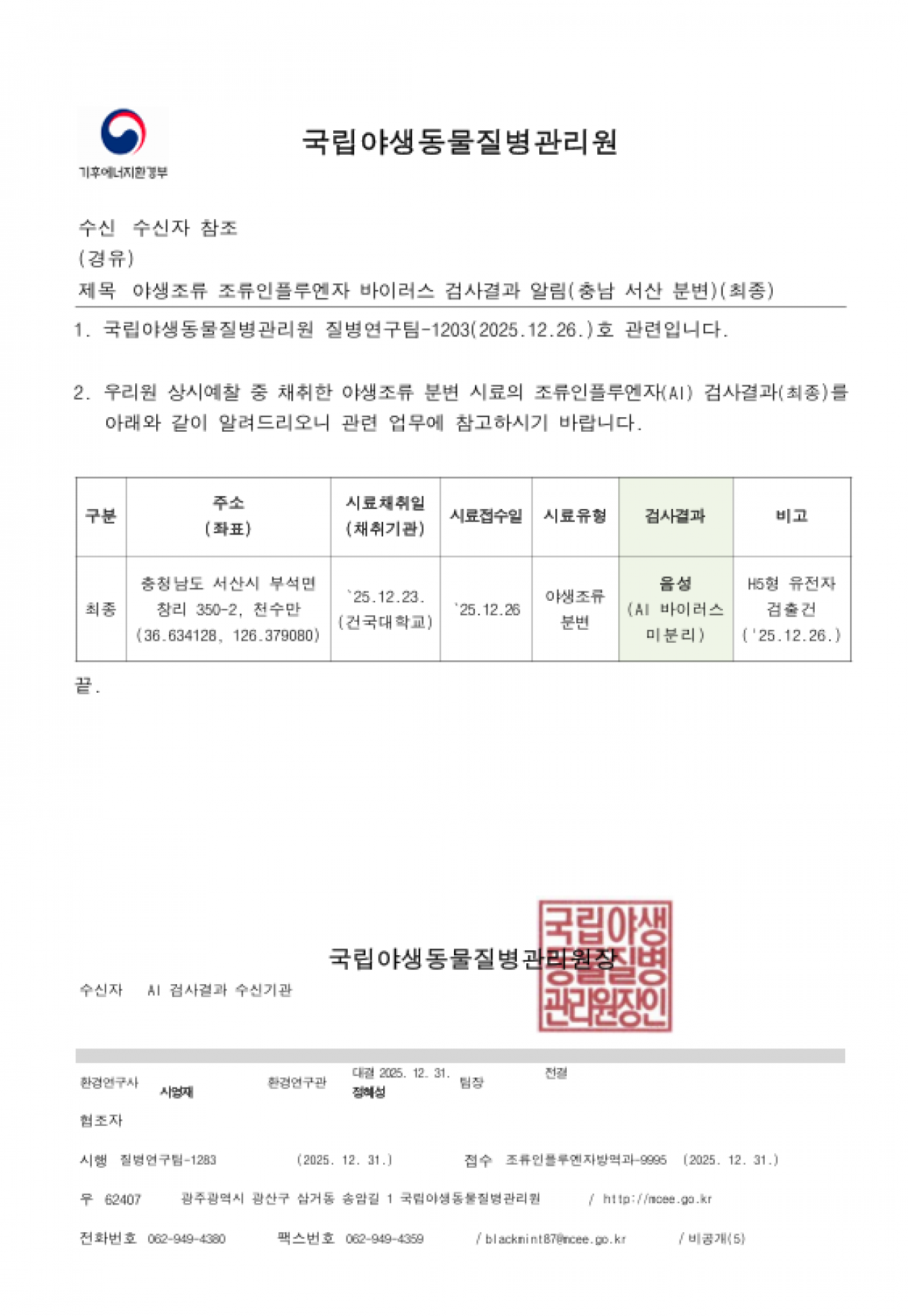 경기(파주), 충남(서산) 및 전남(나주) 소재 야생조류 AI 항원 미분리 지점 관리에 대한 후속조치 알림