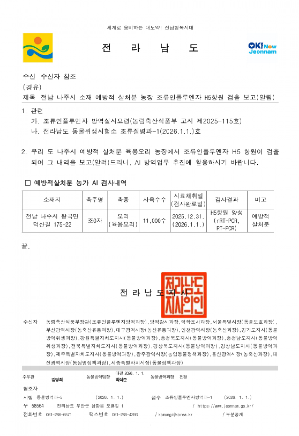 전남 나주 예방적 살처분 가금농장(육용오리) 고병원성 AI 의사환축 발생에 따른 방역강화 조치