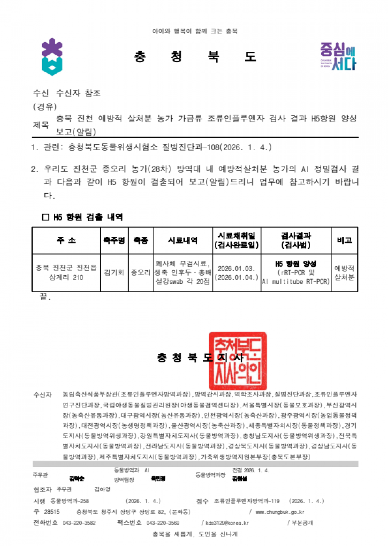 충북 진천 예방적 살처분 가금농장(종오리) 고병원성 AI 의사환축 발생에 따른 방역강화 조치
