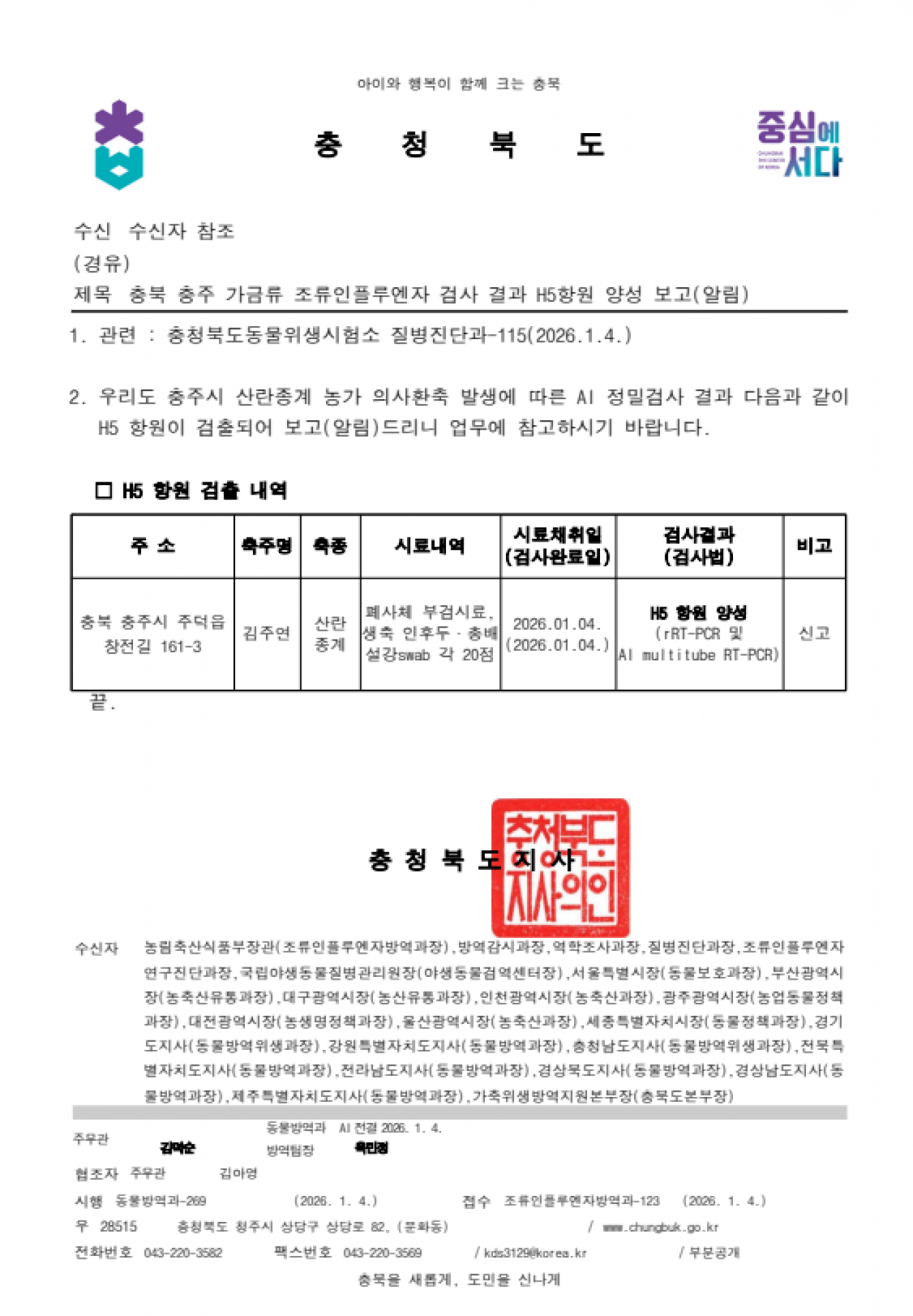 충북 충주 가금농장(산란종계) 고병원성 AI 의사환축 발생에 따른 방역강화 조치
