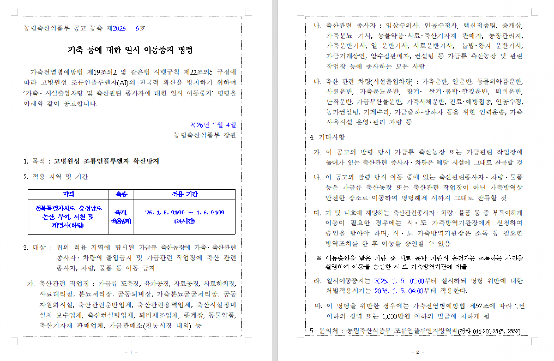 가축(육계, 육용종계) 등에 대한 일시 이동중지(Standstill) 명령 발령 알림