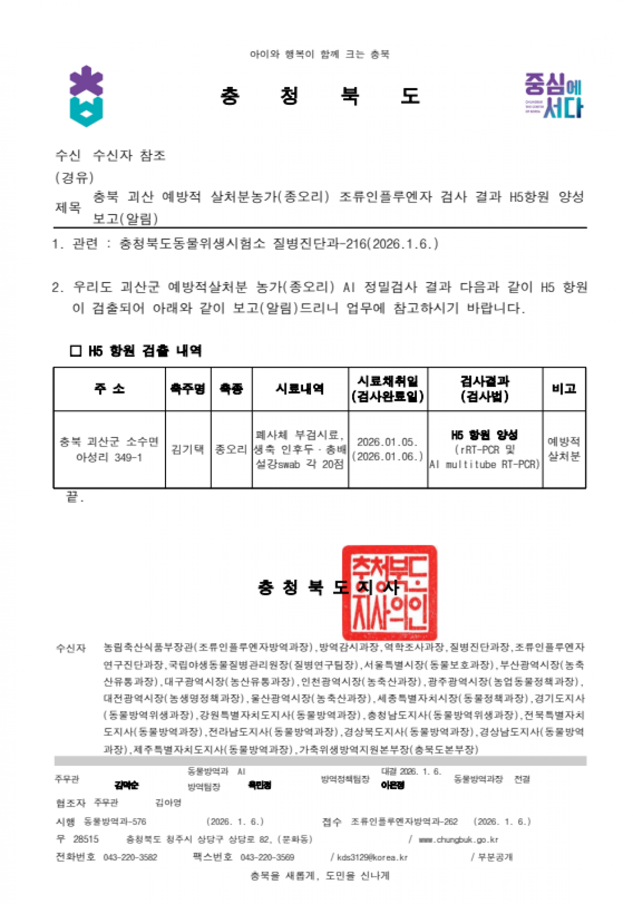 충북 괴산 예방적 살처분 가금농장(종오리) 고병원성 AI 의사환축 발생에 따른 방역강화 조치