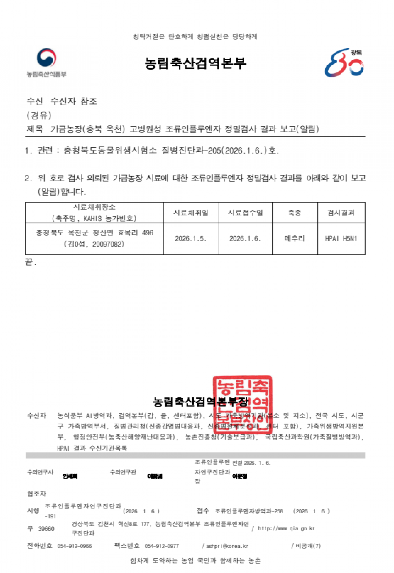 충북 옥천 가금농장(메추리) 고병원성 조류인플루엔자(AI) 확진에 따른 방역조치 알림
