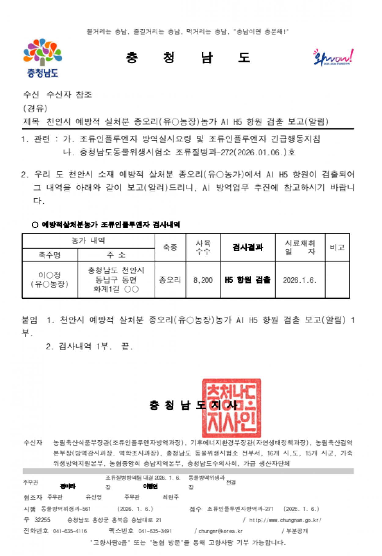 충남 천안 예방적 살처분 가금농장(종오리) 고병원성 AI 의사환축 발생에 따른 방역강화 조치
