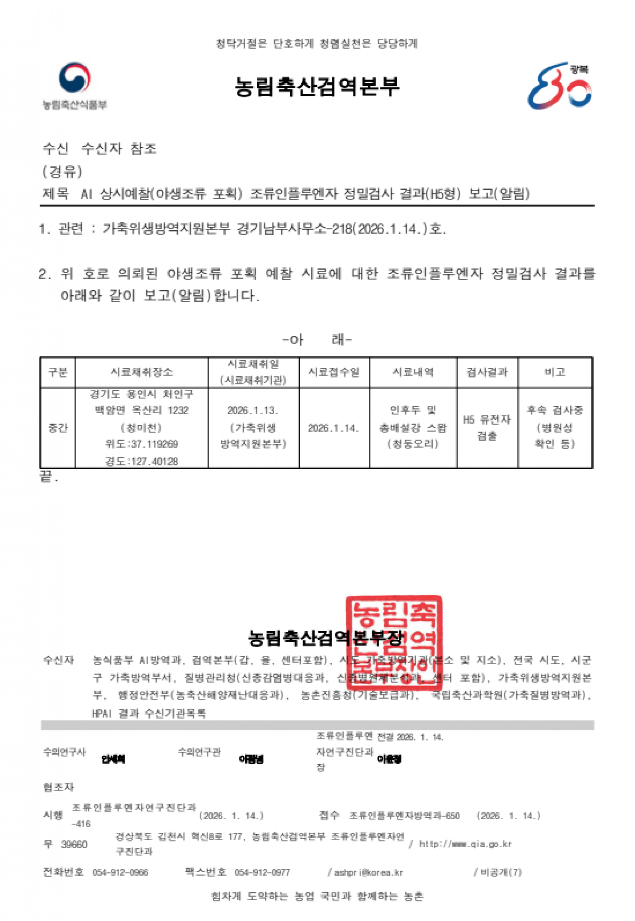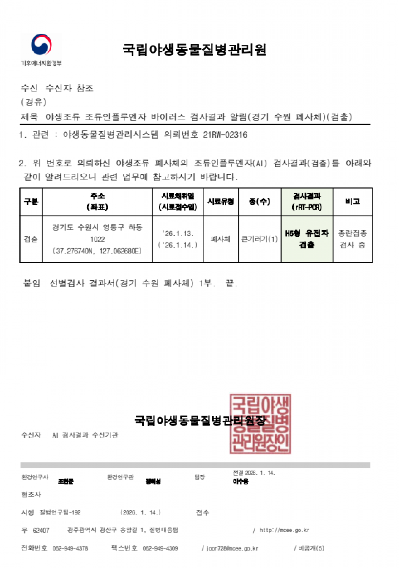 야생조류 조류인플루엔자(H5) 항원 검출에 따른 차단방역 및 예찰 강화 알림