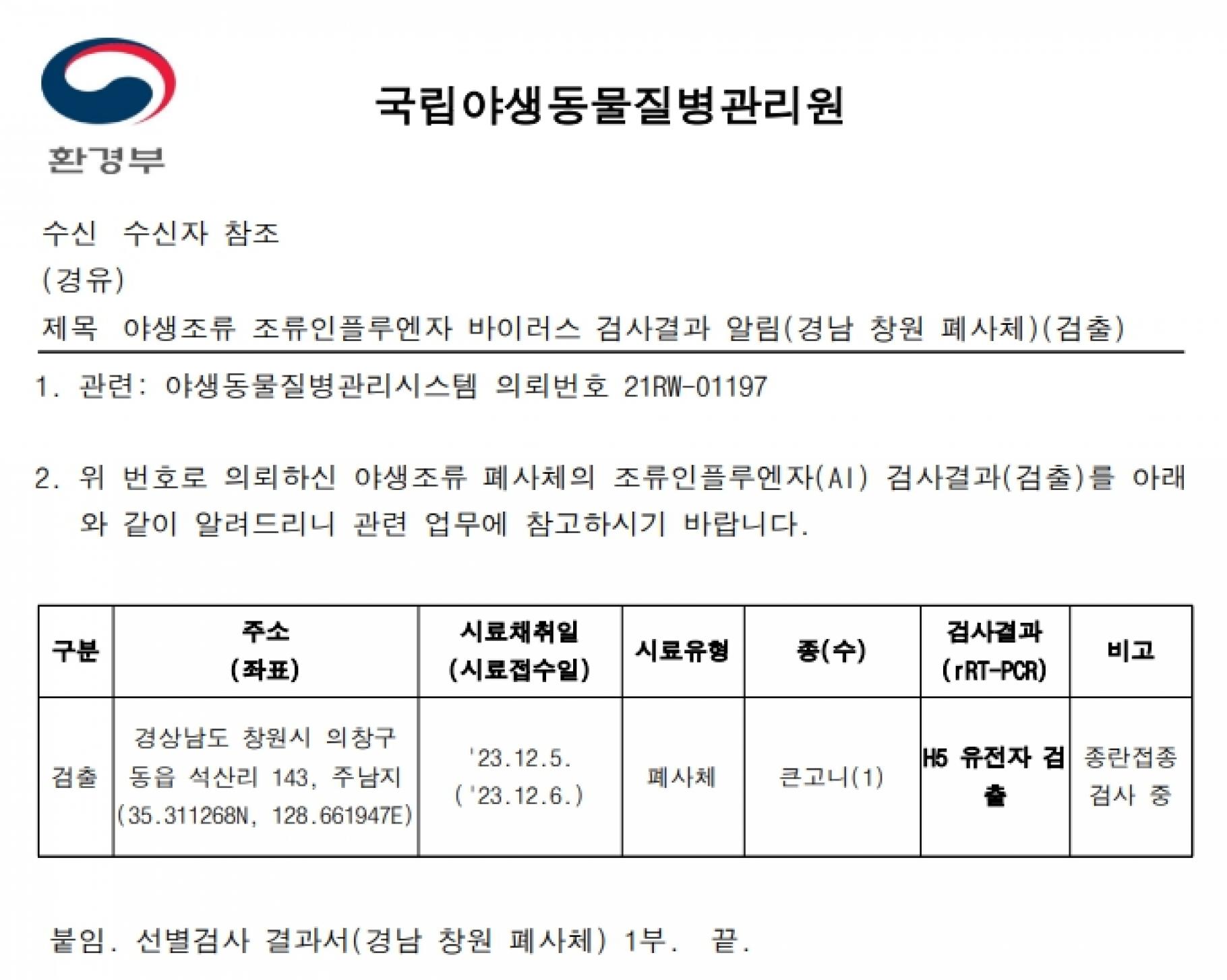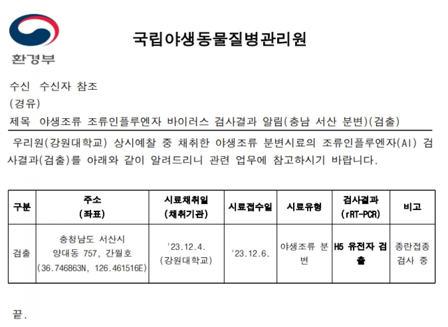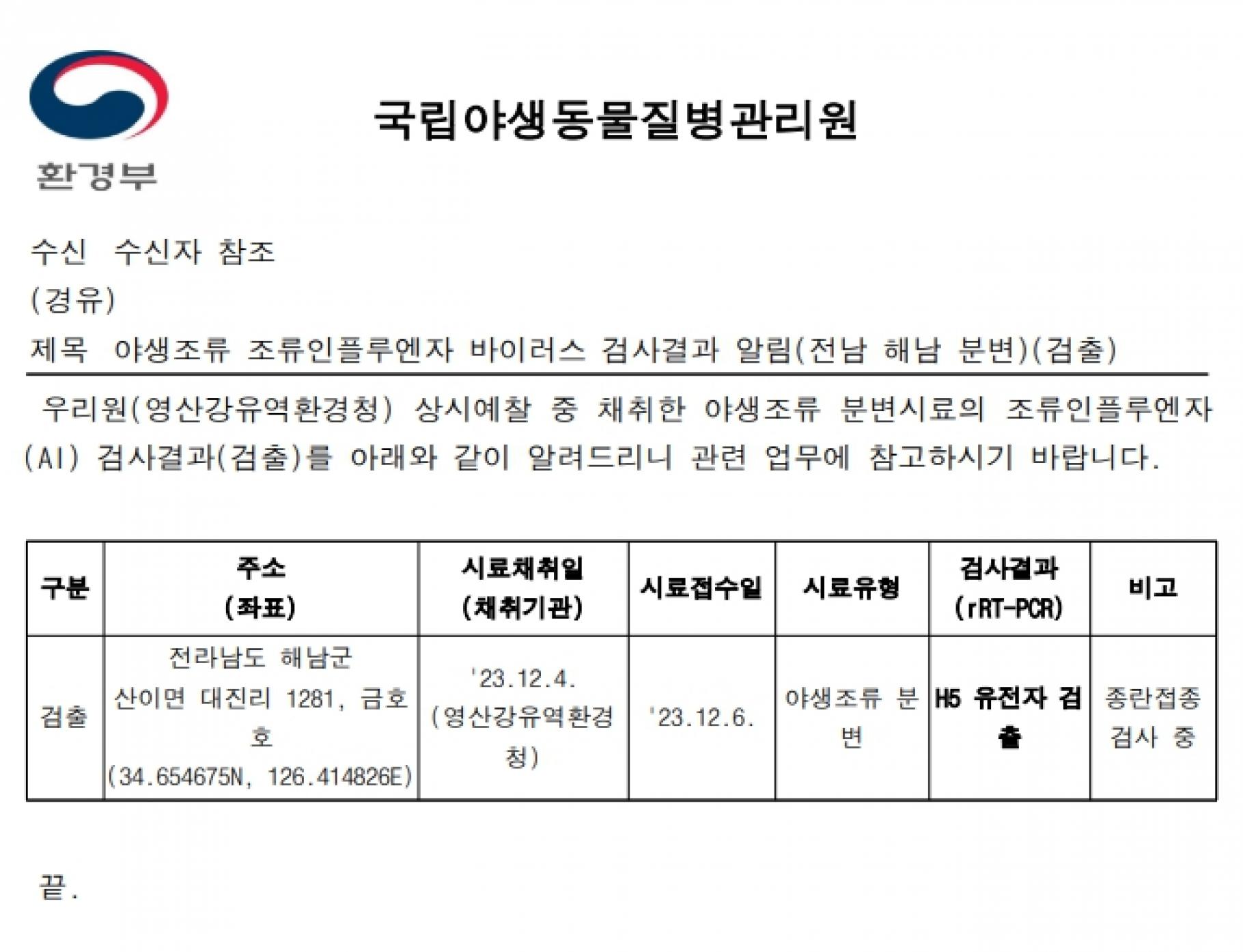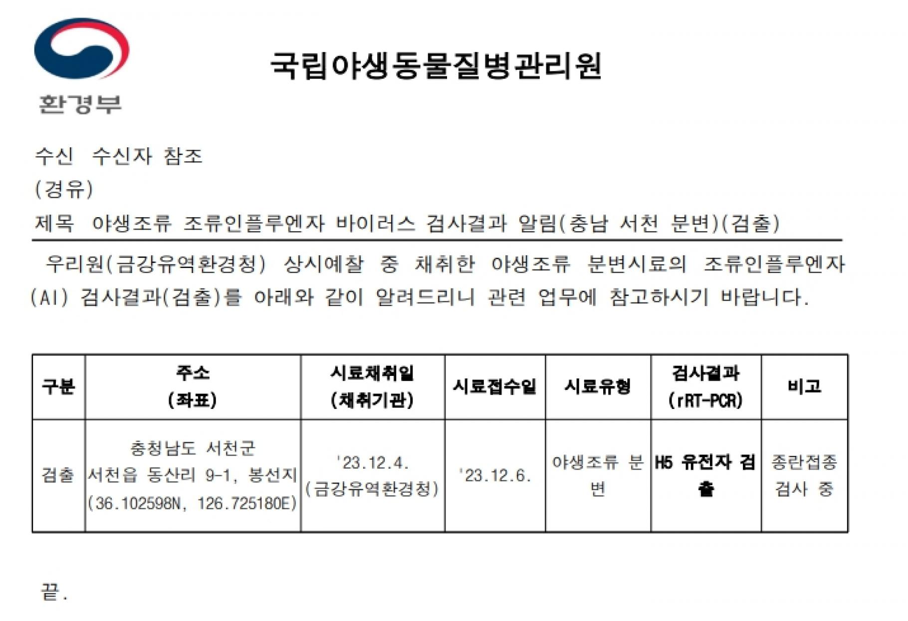 (충남 서산, 충남 서천, 전남 해남, 경남 창원)야생조류 H5형 조류인플루엔자(AI) 항원 검출에 따른 차단방역 및 예찰 강화 알림