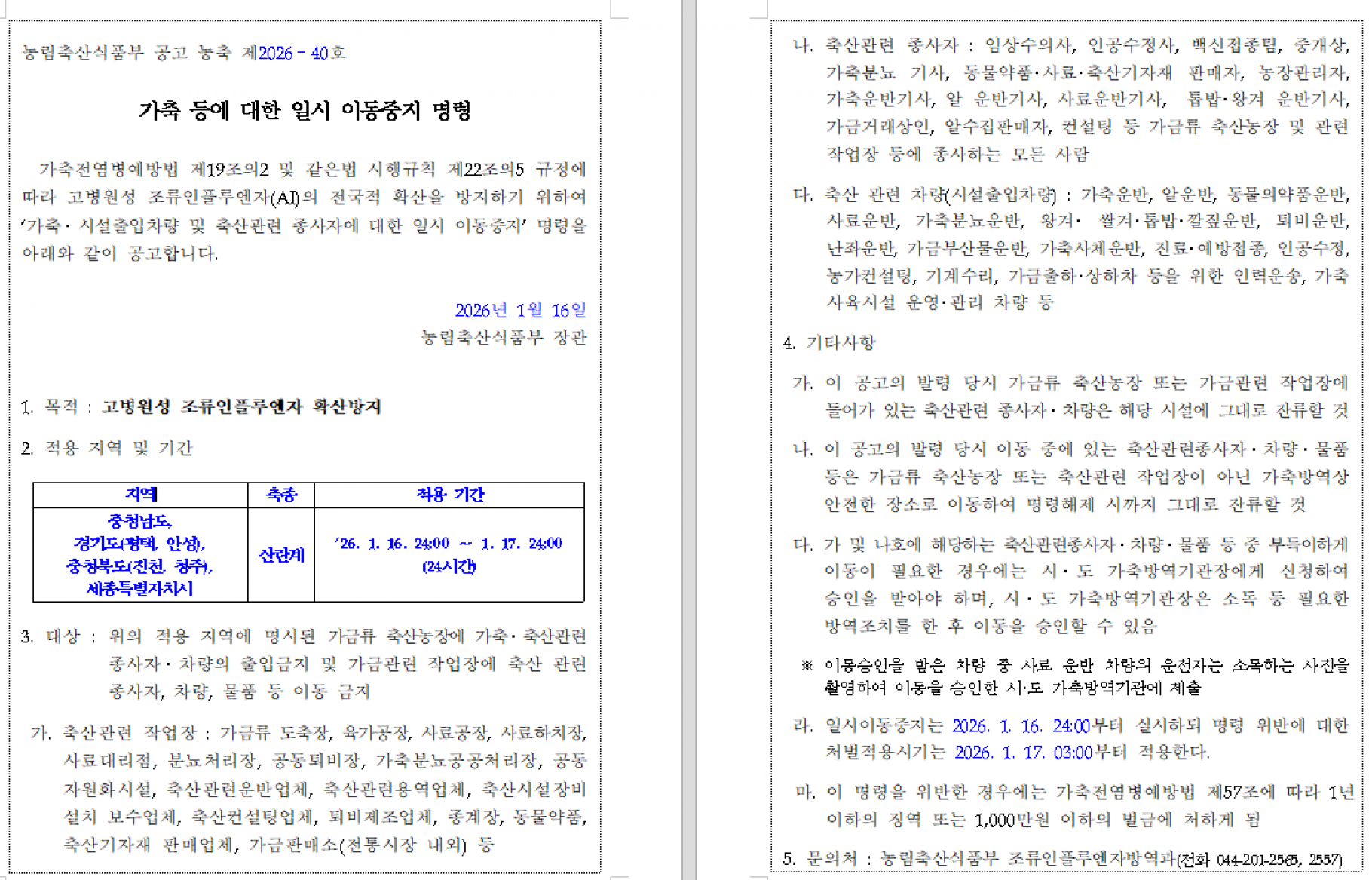 가축(산란계) 등에 대한 일시 이동중지(Standstill) 명령 발령 알림