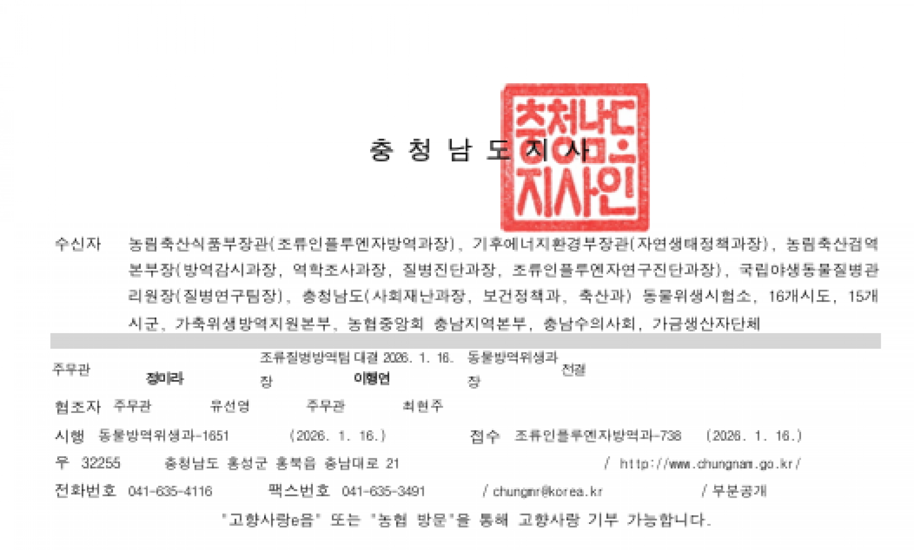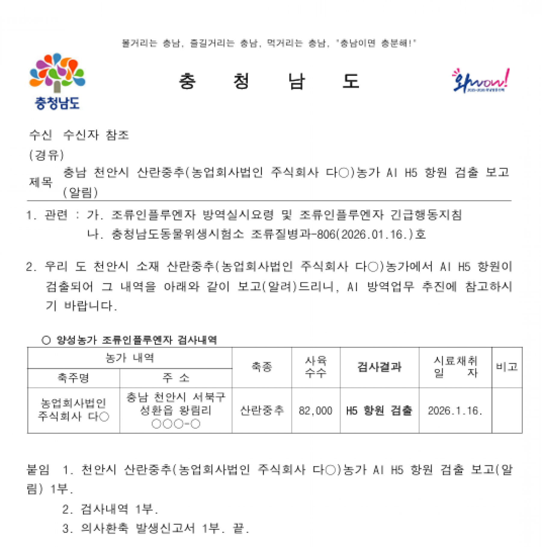 충남 천안 가금농장(산란중추) 고병원성 AI 의사환축 발생에 따른 방역강화 조치