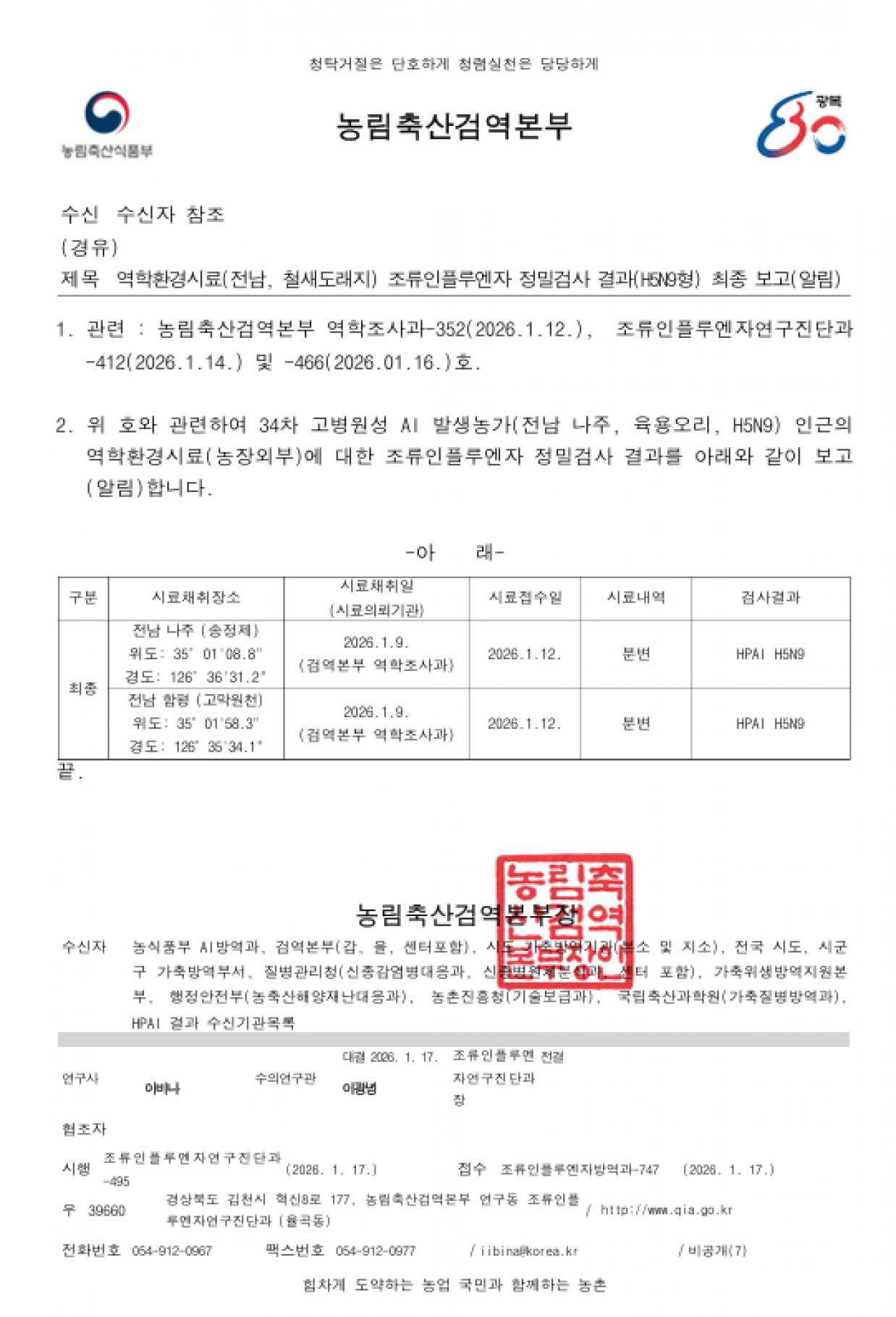 역학 환경시료(농장 인근 철새도래지) 고병원성 조류인플루엔자(H5N9형) 검출에 따른 차단방역 강화 알림