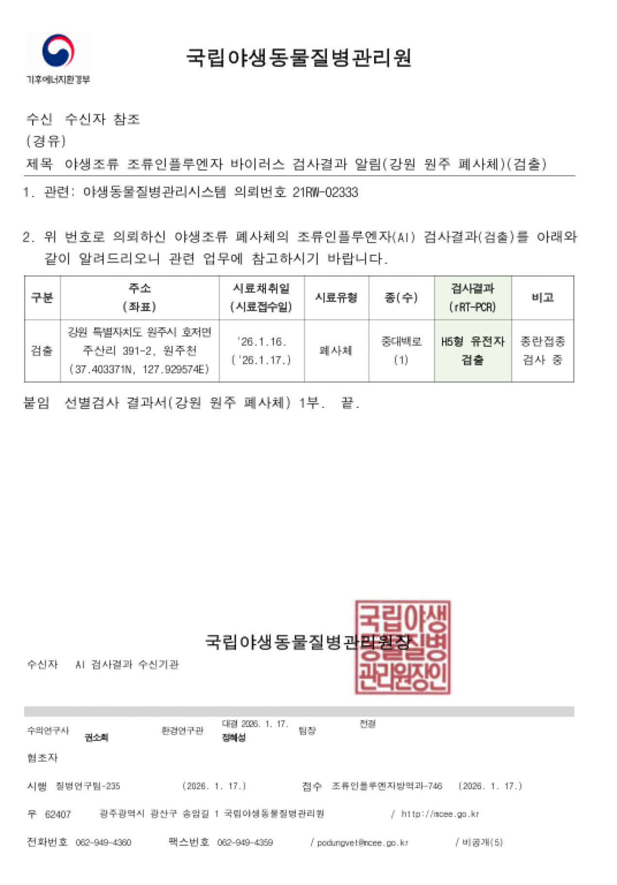 야생조류 조류인플루엔자(H5) 항원 검출에 따른 차단방역 및 예찰 강화 알림