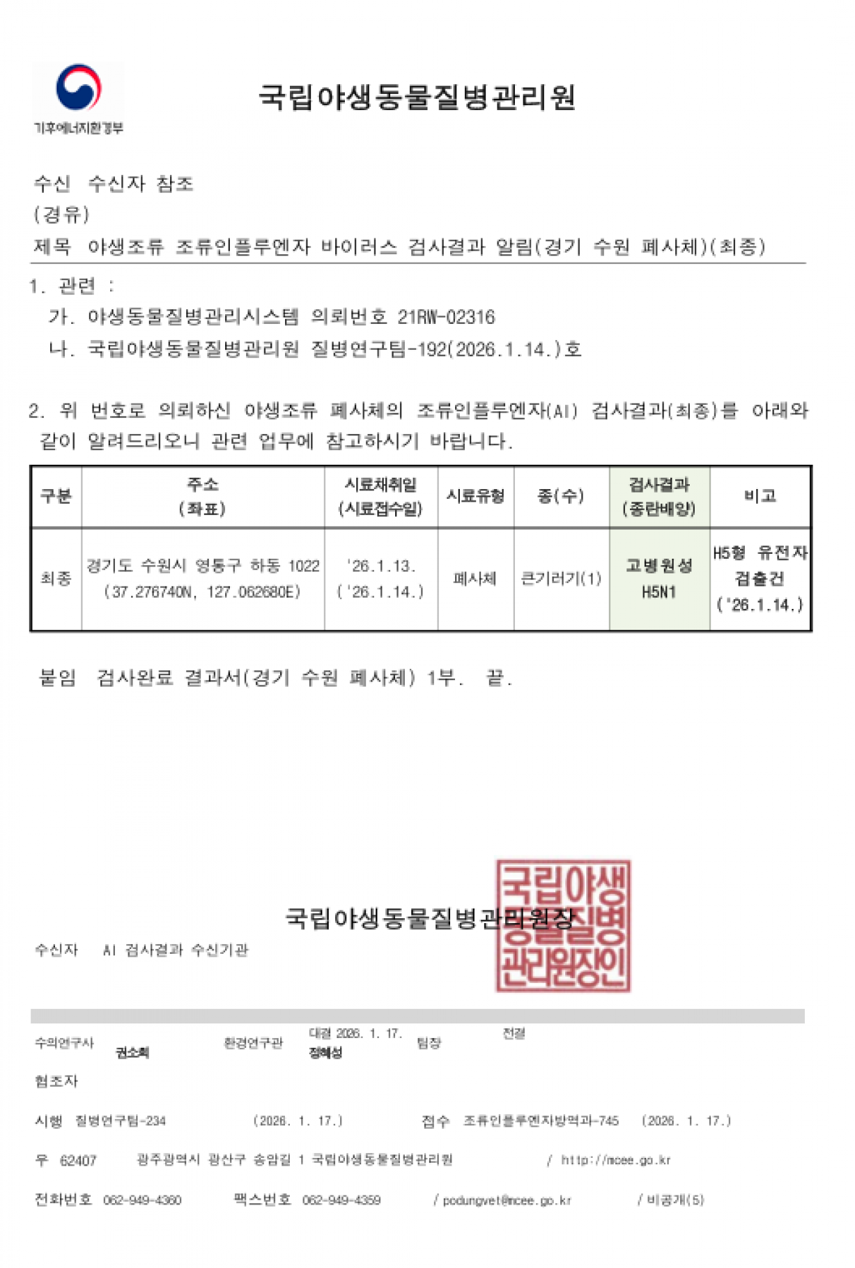야생조류 고병원성 조류인플루엔자(H5N1형) 검출에 따른 차단방역 강화 알림
