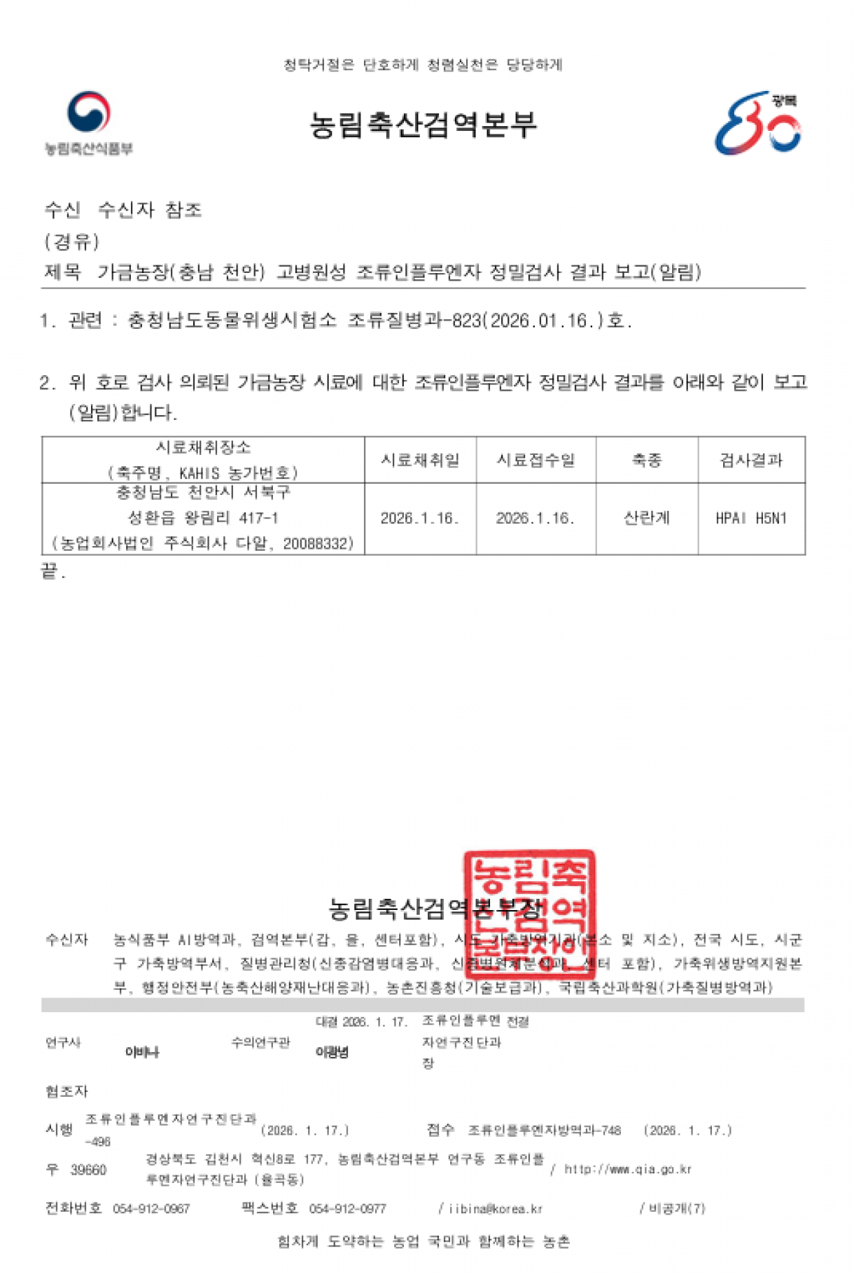 충남 천안 가금농장(산란중추) 고병원성 조류인플루엔자(AI) 확진에 따른 방역조치 알림