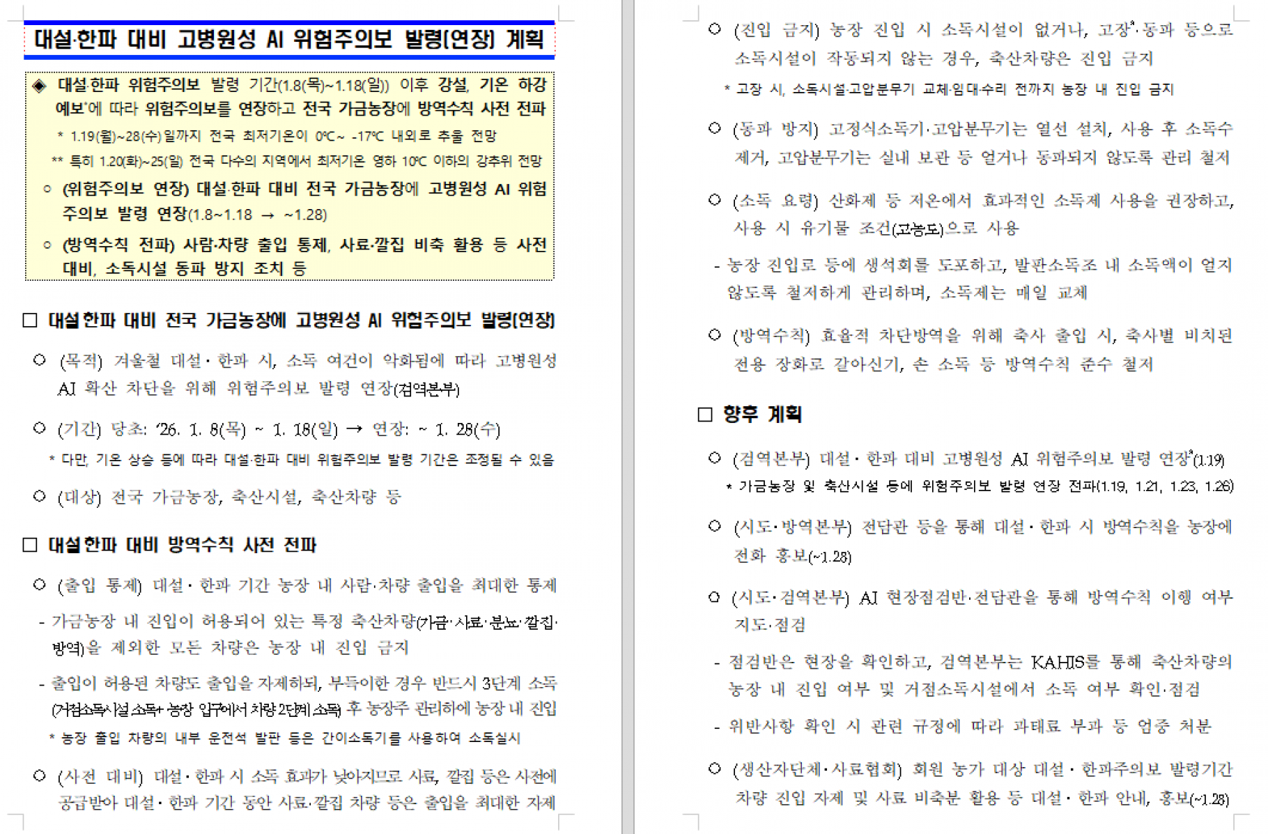 대설?한파 대비 고병원성 AI 위험주의보 발령 연장 및 방역수칙 전파 알림