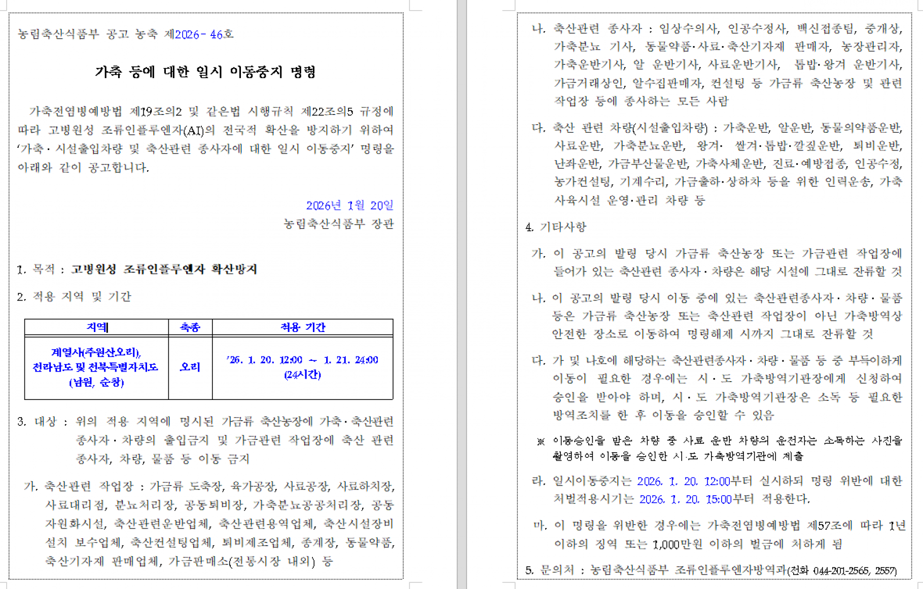 가축(오리) 등에 대한 일시 이동중지(Standstill) 명령 발령 알림