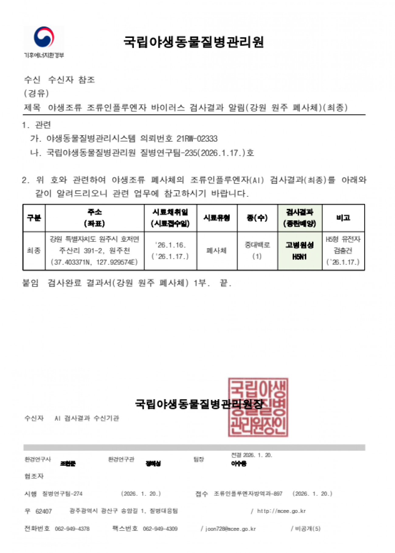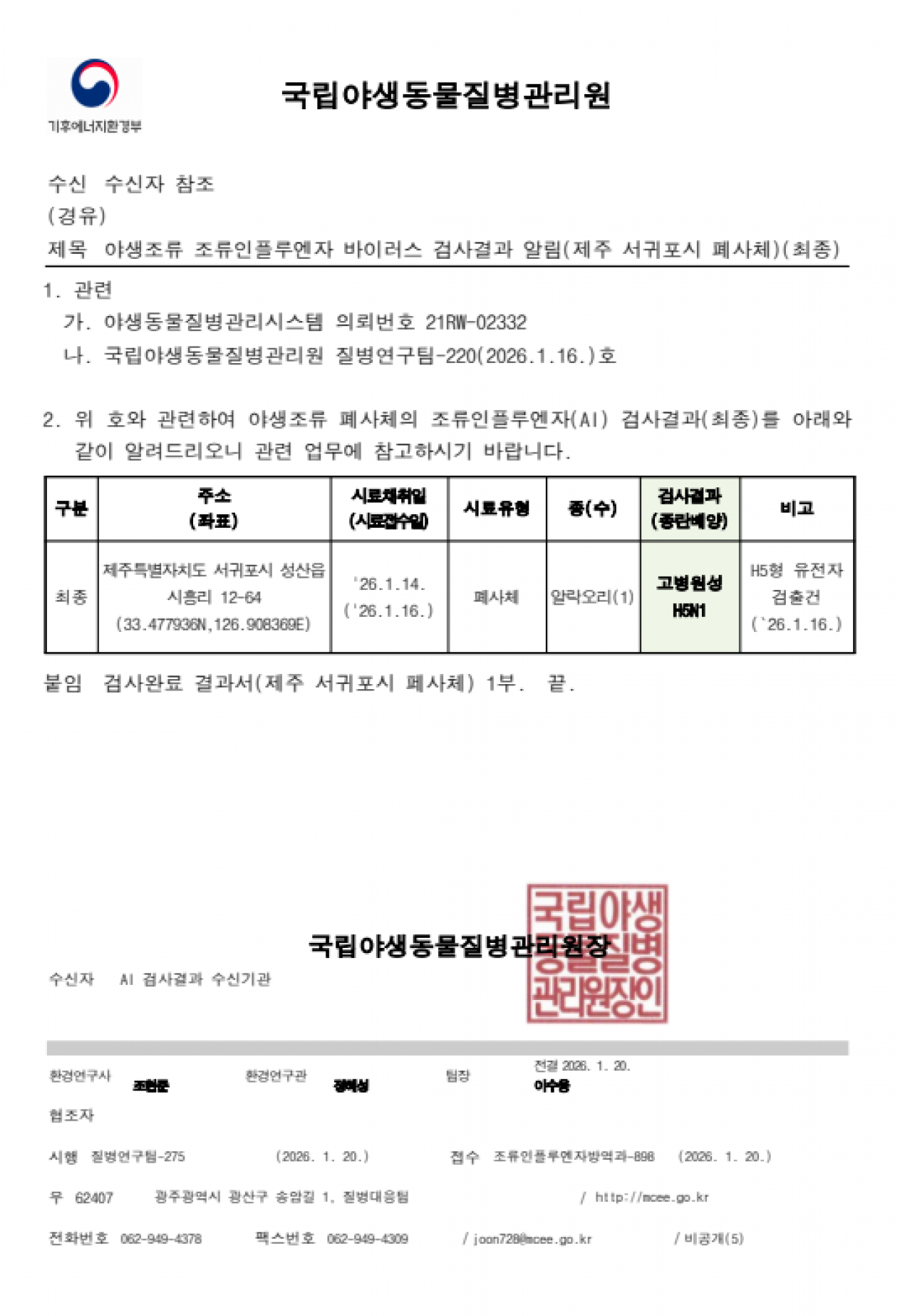 야생조류 고병원성 조류인플루엔자(H5N1형) 검출에 따른 차단방역 강화 알림