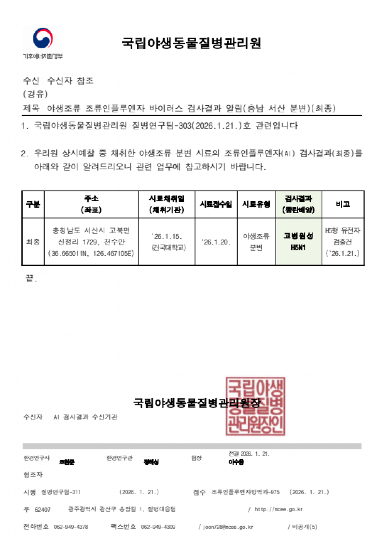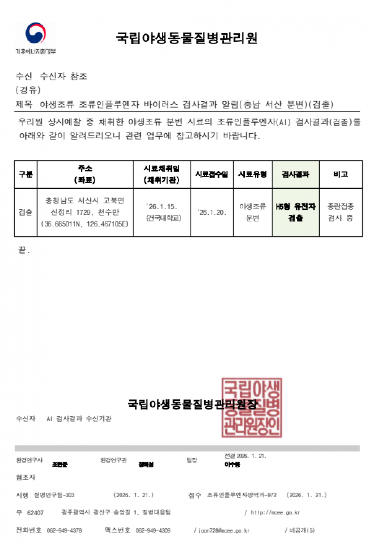 야생조류 고병원성 조류인플루엔자(H5N1형) 검출에 따른 차단방역 강화 알림