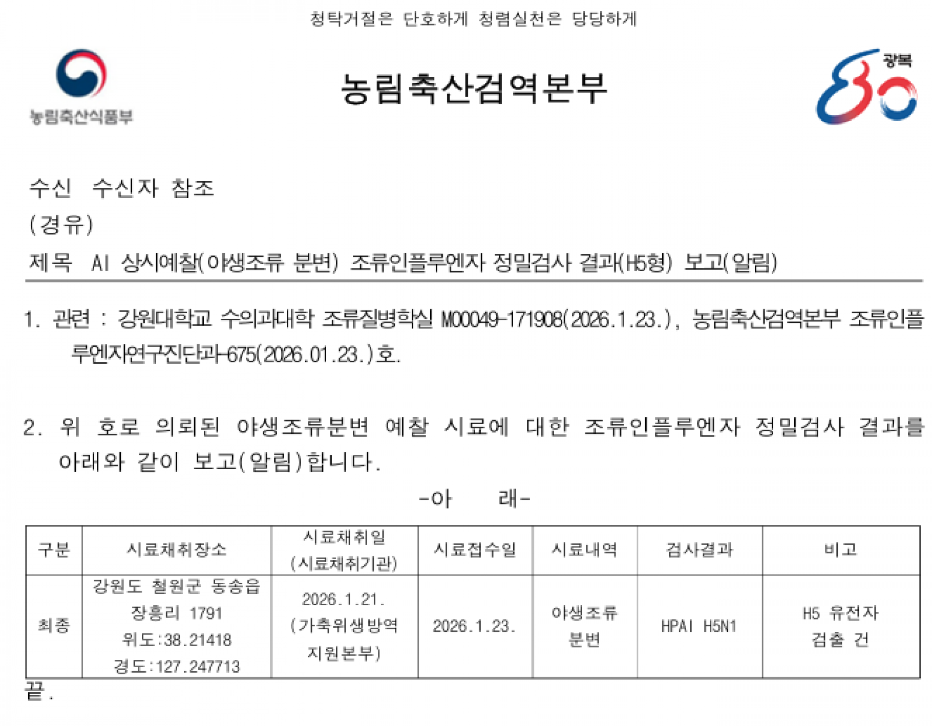 (강원도 철원) 야생조류 고병원성 조류인플루엔자(H5N1형) 검출에 따른 차단방역 강화 알림