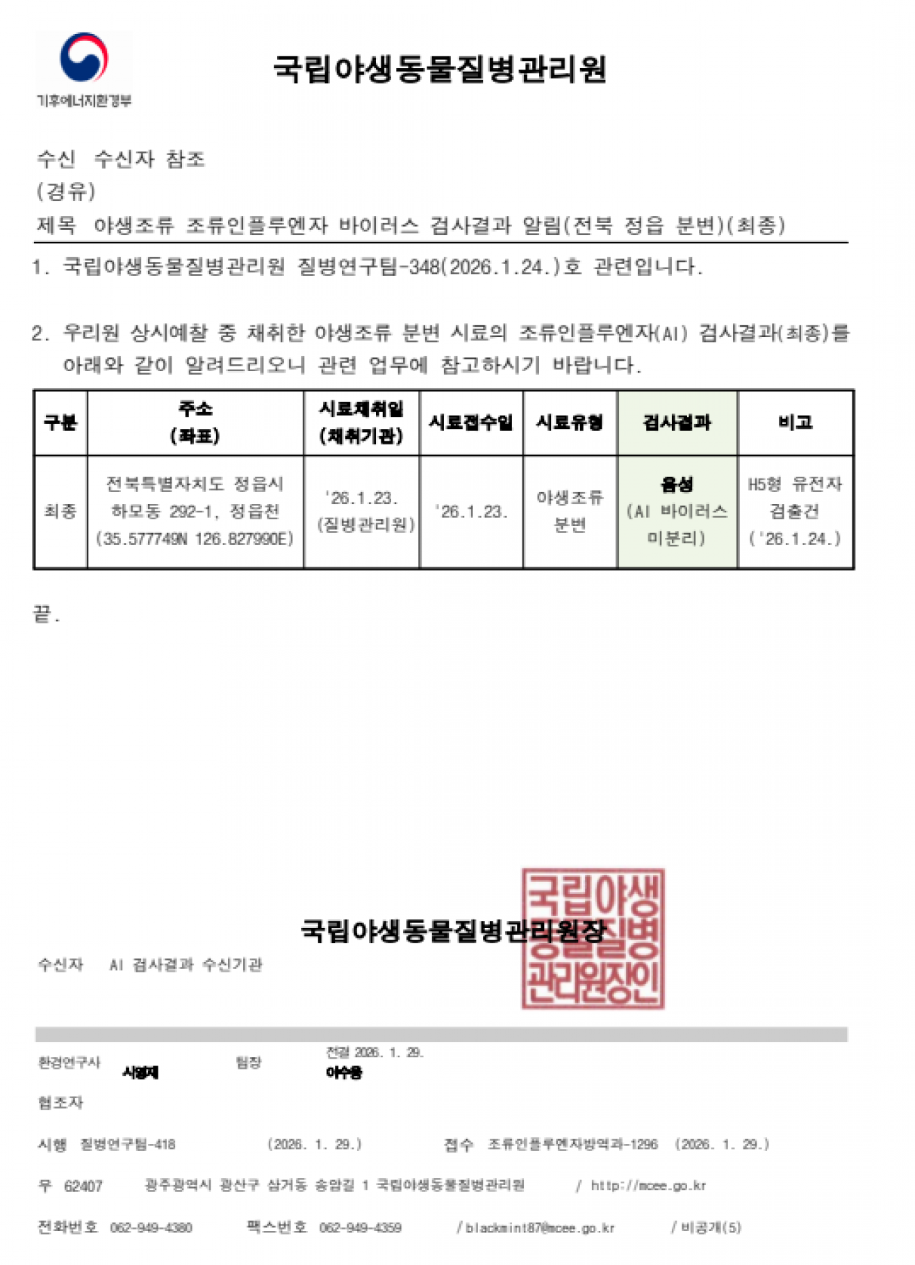 전북 정읍 소재 야생조류 AI 항원 미분리 지점 관리에 대한 후속조치 알림