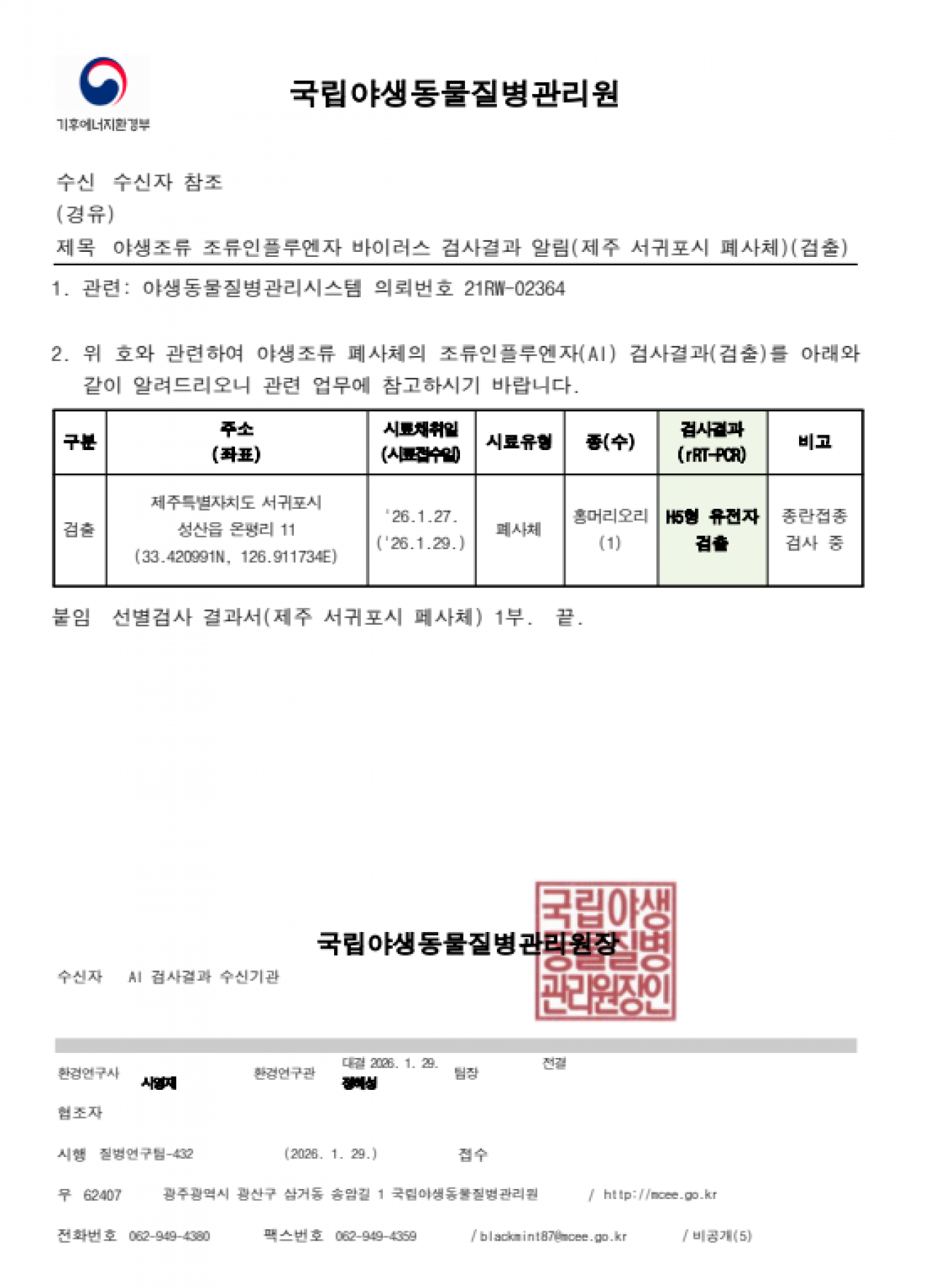 야생조류 조류인플루엔자(H5) 항원 검출에 따른 차단방역 및 예찰 강화 알림