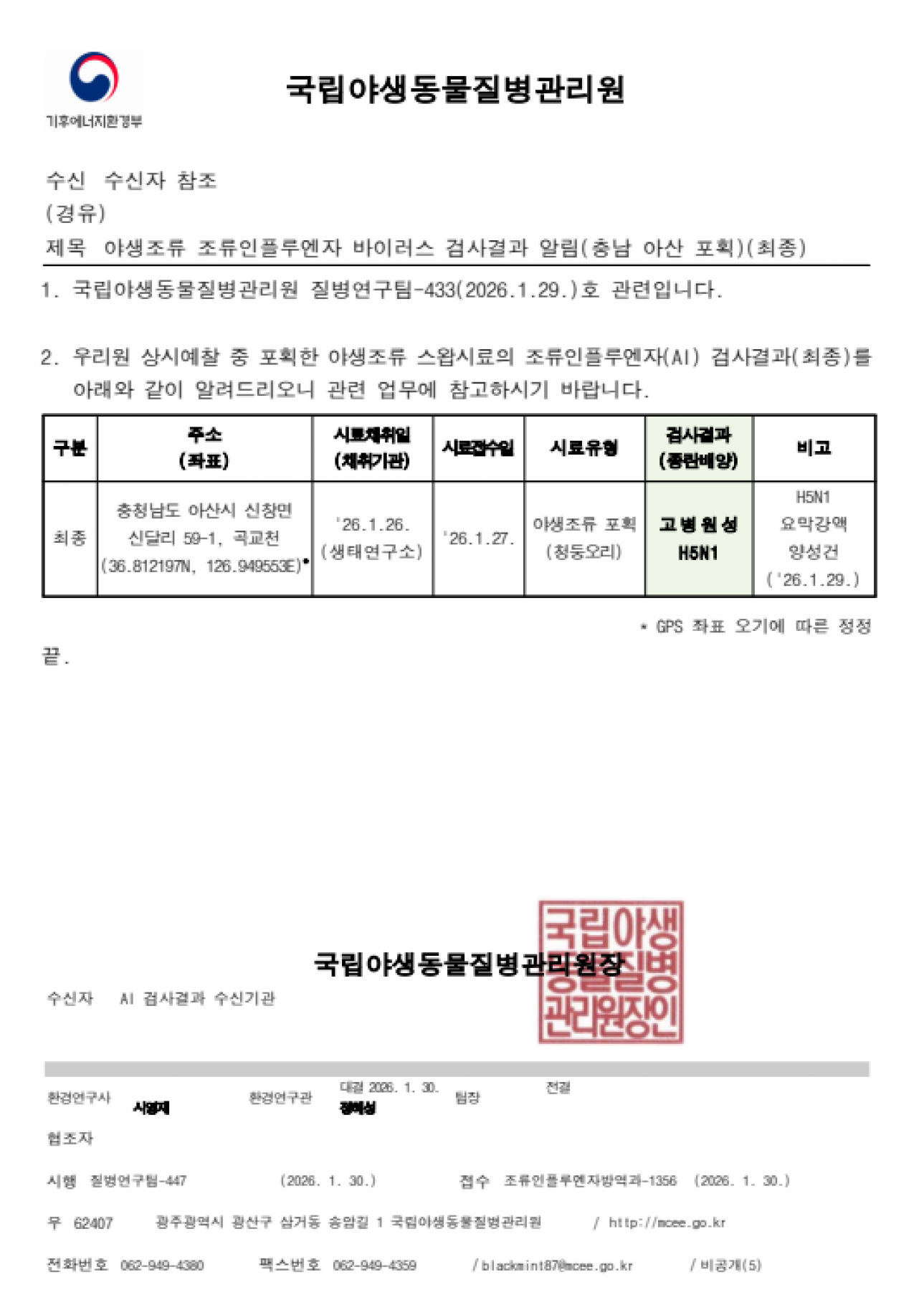 야생조류 고병원성 조류인플루엔자(H5N1형) 검출에 따른 차단방역 강화 알림