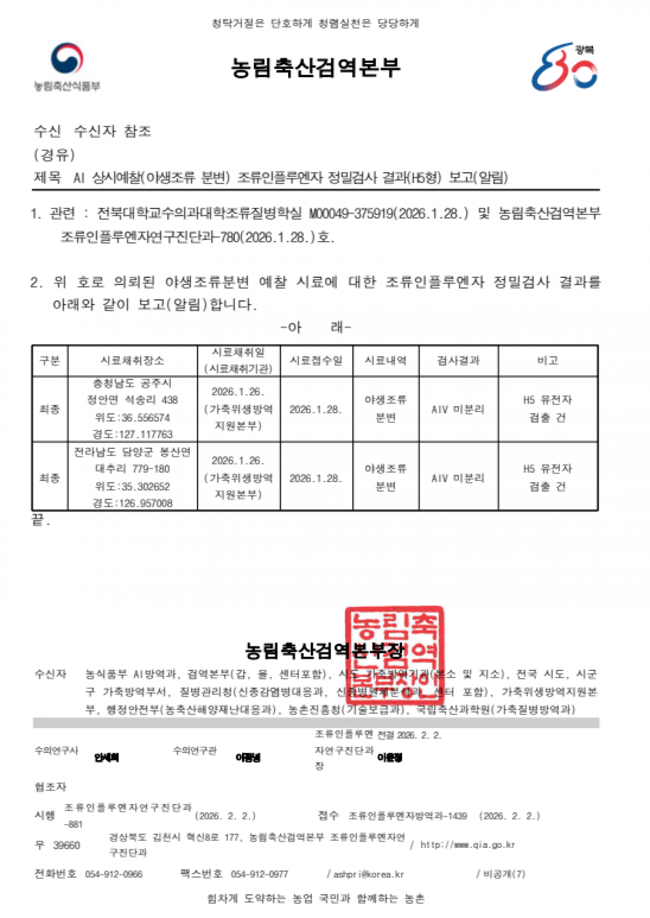 충남 홍성, 충남 아산, 충남 공주, 전남 담양, 전남 함평 및 경남 창원 소재 야생조류 AI 항원 미분리 지점 관리에 대한 후속조치 알림