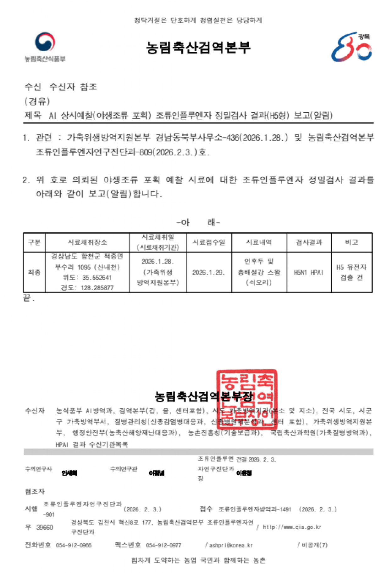 야생조류 고병원성 조류인플루엔자(H5N1형) 검출에 따른 차단방역 강화 알림