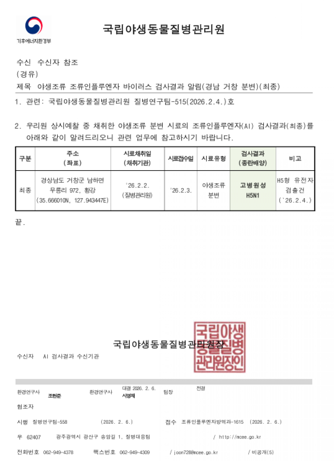 야생조류 고병원성 조류인플루엔자(H5N1형) 검출에 따른 차단방역 강화 알림