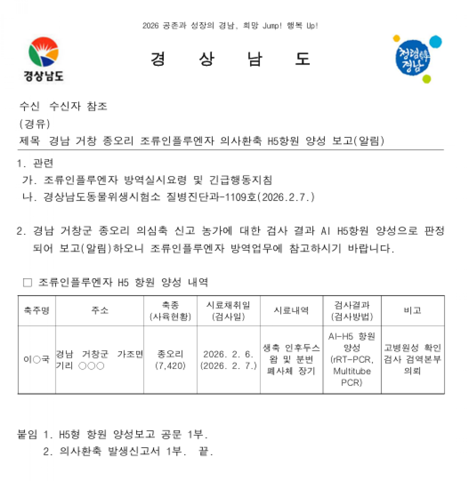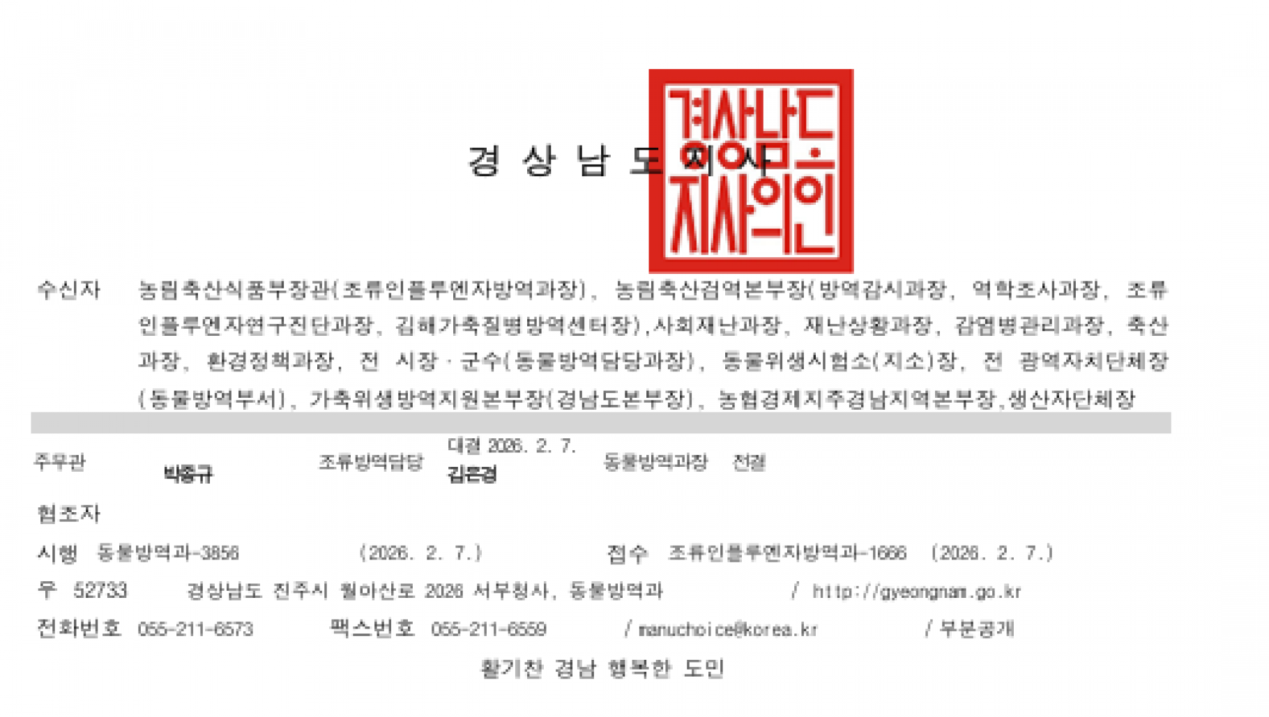 경남 거창 가금농장(종오리) 고병원성 AI 의사환축 발생에 따른 방역강화 조치