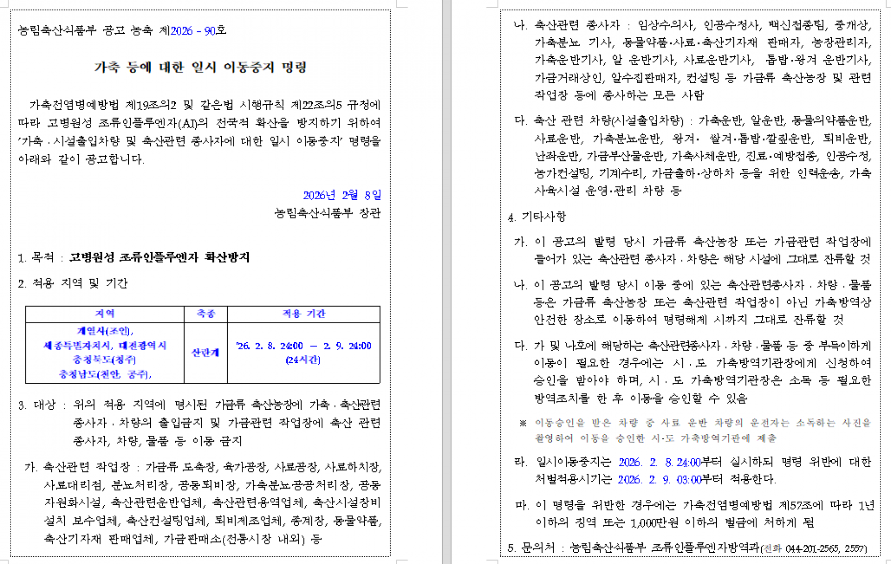 가축(산란계) 등에 대한 일시 이동중지(Standstill) 명령 발령 알림